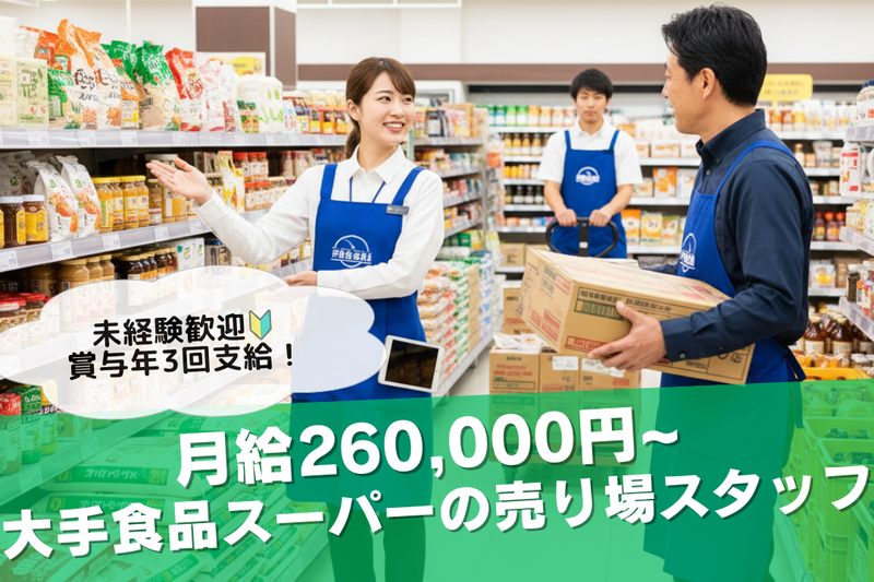 \未経験から即戦力!安定基盤で働く大手食品スーパー正社員/ ・月給26万円〜28万円!(試用期間中は月給28万円スタート) ・賞与年3回(年2回+決算賞与)!頑張りが給与に直結 ・完全週休2日制+5連休制度(パワーチャージ休暇)あり ・退職金制度、産休・育休実績など、長く安心して働ける環境