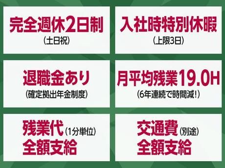 勤務時間 総労働時間:1ヶ月あたり162時間 【勤務時間※プロジェクトによる】 基本/8:00~17:00 ※月平均残業時間17.0H(7年連続時間減) ※自動車通勤、場合により可(就業場所の駐車場有無による)