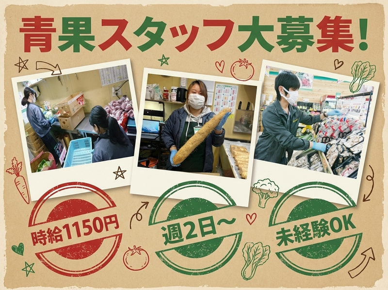 職場環境 青果部門は、店内でも比較的落ち着いたエリア。 レジ前のようにバタバタすることは少なく、モクモクと作業に集中できる環境です✨ ⏩ 基本は決まった手順の繰り返し作業 ⏩ 役割分担が明確でやることが分かりやすい ⏩ ベテランスタッフが近くにいるので安心 喫煙所:喫煙所あり(屋外)