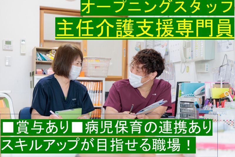 【アピールポイント】 2025年2月新規オープン予定!! 居宅介護支援事業所の主任ケアマネ(管理者)を募集します! ■オープニングスタッフ ■完全週休二日制(土日休み) ■病児保育の提携など福利厚生充実!