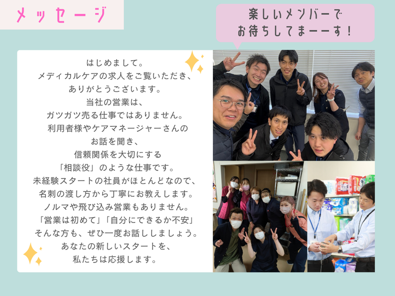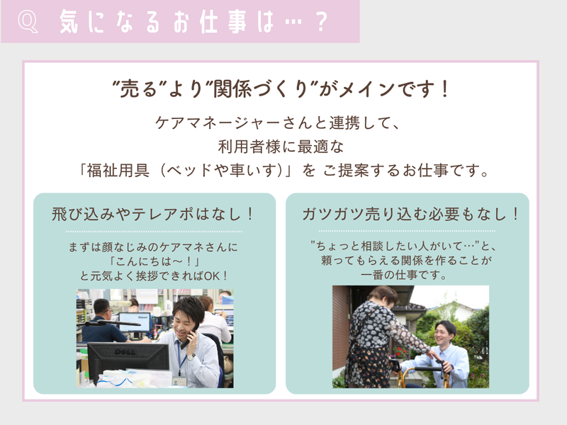 仕事内容 【営業経験者のあなたへ】 「数字、数字と毎日詰められる…」 「お客様のためにならない商品を売るのが辛い」 「子供の行事に行きたいけど、休みたいと言い出せない」 もし今、そんな悩みを抱えているなら、 ぜひ一度、当社の話を聞いてください。 私たちは、あなたのその「営業経験」を もっと優しい形で活かせる場所です。 ✨メディカルケアの魅力ポイント✨ ✅ガツガツした営業は一切なし! ✅1時間単位で有給が使える(パパに大好評!) ✅賞与年3回+インセンティブあり ✅家賃補助&住宅手当が充実 ✅男性の育休取得・復帰実績あり ✅子育て応援休暇で運動会も絶対参加! 「営業に疲れちゃった人の、 受け皿になりたい」 採用担当は本気でそう思っています。 ここには、理不尽なノルマも、 押し売りのような営業もありません。 あるのは「お客様からのありがとう」と、 「家族を大切にできる時間」です。 ■気になるお仕事は…? (”売る”より”関係づくり”がメインです) ┈┈┈┈┈┈┈┈┈┈┈┈┈┈┈┈┈┈•• ケアマネージャーさんと連携して、 利用者様に最適な 「福祉用具(ベッドや車いす)」を ご提案するお仕事です。 飛び込み営業やテレアポは一切ナシ。 まずは顔なじみのケアマネさんに 「こんにちは~!」と元気よく挨拶できればOK! ガツガツ売り込む必要はありません。 「〇〇さん、ちょっと相談したい人がいて…」 と、 頼ってもらえる関係を作ることが一番の仕事です。 ✅スーツじゃなくてOK! 堅苦しいのは苦手…という方も安心。 ポロシャツやチノパンなど、 動きやすい服装で働けます。 お客様にも「親しみやすい」と好評なんです。 ■子育て世代の社員が急増中の理由 ”家族ファースト”な制度 ┈┈┈┈┈┈┈┈┈┈┈┈┈┈┈┈•• ✨「1時間単位」で有給が使える! 「子供が熱を出したから病院へ」 「今日はお迎え担当だから1時間早く帰る」 そんな柔軟な働き方が可能です。 これ、本当に便利です! ✨運動会は絶対参加!「子育て応援休暇」 参観日や運動会など、 お子さんに関することなら 何でも使える特別休暇があります。 「仕事だから…」と諦める必要はありません。 ✨男性育休も当たり前 これから家庭を持ちたい方も安心。 実際にパパ育休を取得して 復帰した先輩も活躍中です! ■正直にお伝えします (ぶっちゃけトーク) ┈┈┈┈┈┈┈┈┈┈┈•• ✅力仕事、あります! ベッドや車いすを運ぶので、 デスクワークだけの仕事ではありません。 「腰、大丈夫かな…」と心配な方、ご安心ください。 重いものは「必ず2人で運ぶ」 などチームで協力しています。 「ジムに行かなくても筋トレになる(笑)」 なんてポジティブな先輩も多いですよ! ✅土曜出勤の場合もあり お客様の都合で土曜に出ることもありますが、 その分、平日にしっかり振替休日を取れます。 「平日の空いている時間に役所や買い物に行ける!」 と、逆にメリットに感じているスタッフも多いです◎ ■経験者だからこそ分かる 働きやすさがここに ┈┈┈┈┈┈┈┈┈┈┈┈┈┈•• iPadやiPhoneを一人一台支給。 事務作業を効率化して、 18時の定時退社を推奨しています。 「家に帰って家族とご飯を食べる」 そんな当たり前の幸せを、 ここで取り戻しませんか?