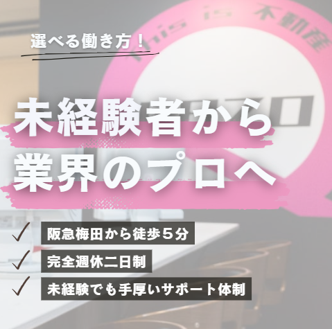 仕事内容 ⭐完全週休二日制⭐ スタッフの働きやすさを重視!!  ̄ ̄ ̄ ̄ ̄ ̄ ̄ ̄ ̄ ̄ ̄ ̄ ̄ ̄ ̄ ̄ ̄ ̄ ̄ 当社では スキルや知識はもちろんですが、 「モチベーション」が 働くうえで一番大事だと考えています! より働きやすい環境を作り、 モチベーションを高く働けるよう 取り組んでまいりました!  ̄ ̄ ̄ ̄ ̄ ̄ ̄ ̄ ̄ ̄ ̄ ̄ ̄ ̄ ̄ ̄ ̄ ̄ ̄ ◎残業0で必ず17時に上がりたい! ◎完全週休2日制で働きたい! ◎無理なく週3日休みで働きたい! ◎土日は必ず休みたい! ◎時間に縛られず、 フレックスタイム制で働きたい! ◎1日の勤務を8時間以下にしたい! ◎育児休暇がほしい! など... 当社では あなたにあった自由な働き方が選択可能! 希望の働き方を 取り入れられる会社なので 面接の際に あなたの希望をお気軽にお聞かせ下さい!  ̄ ̄ ̄ ̄ ̄ ̄ ̄ ̄ ̄ ̄ ̄ ̄ ̄ ̄ ̄ ̄ ̄ ̄ ̄ ※しっかり休めても安定収入!※ 当社は完全週休2日制でも月給25万円~! 繁忙期以外は土日連休も可能で、 プライベートを大切にしながら 長くご活躍いただけます! ※未経験でも高月給スタート!※ 各種手当も充実! 休みも確保しながら、 安定収入が得られるのもポイント! === *時代遅れのノルマは払しょく!* 不動産業界はノルマや数字に厳しくつらい、、、 当社ではノルマや数字に縛られる事も 責めることもありません! もちろん、失敗の責任を押し付ける事は一切ナシ! === ◇飛び込み営業なし ◇テレアポ営業無し ◇研修制度充実 当社は集客を重要視しており、 多くのお客様に お問い合わせいただいています! 多くのお客様を対応していただくので、 そのぶん成長の機会を多くご用意! 営業未経験の方でも 安心してスタートしていただけます✨  ̄ ̄ ̄ ̄ ̄ ̄ ̄ ̄ ̄ ̄ ̄ ̄ ̄ ̄ ̄ ̄ ̄ ̄ ̄ ※堅苦しいマニュアルやルールなし※ 接客などは 個人のスタイルややり方を尊重。 やりやすい方法で仕事ができます! 自分自身で試行錯誤しながら 結果が出せるのが やりがいや成長につなげられます! わからないことがあれば 不動産のプロの先輩スタッフが 丁寧にサポート✨  ̄ ̄ ̄ ̄ ̄ ̄ ̄ ̄ ̄ ̄ ̄ ̄ ̄ ̄ ̄ ̄ ̄ ̄ ̄ *お客様のありがとう=年収に!* お客様に喜んでいただいた分だけ 年収アップにつながり、 1年目から年収600万円以上も✨ 「もっと収入を上げたい!」 という方のサポート体制も万全なので 『がっつり稼ぎたい』 といいう方もお待ちしています!  ̄ ̄ ̄ ̄ ̄ ̄ ̄ ̄ ̄ ̄ ̄ ̄ ̄ ̄ ̄ ̄ ̄ ̄ ̄ 【仕事内容】 お客様に喜んでいただいた数が 直接年収に反映される、 不動産営業(賃貸や売買の仲介メイン) をお願いします! 【具体的には】 物件をお探しのお客様から、 ✅ご希望の条件などをヒアリング ∟満足していただける物件を 親身になって一緒に探します。 ✅よい物件が見つかったら内覧へ ∟物件を回り良いところや 利便性などをお伝えします。 ✅契約成立までのお客様のサポート ∟お客様のご契約成立までに 必要な業務をサポート ✅物件の鍵をお渡し ∟鍵のお渡しから お見送りまでが一連のお仕事。  ̄ ̄ ̄ ̄ ̄ ̄ ̄ ̄ ̄ ̄ ̄ ̄ ̄ ̄ ̄ ̄ ̄ ̄ ̄ 【新店オープニングも同時募集】 新規オープン計画中✨ 大阪市北区鶴野町1-3 安田ビル 4階 ※既存店も近くなので、 先に働く事も可能です。