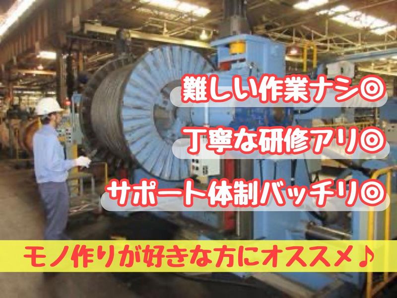 仕事内容 ■製造スタッフ 東京製綱のワイヤロープ部門のメイン製造 工場での多種多様なロープ(数百種)の 「焼入れ工程」をお願いします! 主に機械の操作が中心です。 チームでの炉の管理・原料の設置 <未経験・無資格から始めやすい!> 入社後、安全研修を行い 危険に対する対処法を学びます。 その後も月1回は安全に関する会合を行う ので、安全に対する意識はきちんとしています! 「無資格だけど…。」 そんな方も業務で必要な資格 (クレーン、玉掛け)は会社負担で 取得できるので、安心して下さい!! <20代・30代が活躍中> 20~30代の社員が活躍しています! 製造経験者もいれば異業種から転職 してきた方もいます。 様々な方が年齢関係なく チームワークを持って助け合っています! モノづくりへの興味さえあれば大歓迎! 「製造の仕事をしたことがないから不安…」 という方、安心してください。 未経験や無資格はもちろん 異業種からの転職も大歓迎! 入社後に3日間の研修があるので、 まずは安全や品質、設備について学べます。 現場では3~4名のチームを組み、 先輩の業務を近くで見れるので 初歩的な知識から専門的な技術まで しっかり覚えられますよ。 玉掛け・クレーン資格は費用会社負担で 必ず取得していただくので 仕事の幅がどんどん広がり 自分の成長が手に取るように分かります。 資格取得支援制度を活用して さらにステップアップも可能です! 明治からの老舗ですが、まだまだ伸びます。 ワイヤーロープ商品では、 日本のトップシェアを獲得した当社 (線材製品協会統計※2016年3月受注実績) 国内に限らず、海外へも積極的に進出しています。 130年前から培ってきた技術とノウハウで、計7ヶ国・11社の海外子会社を設立! 今ではワイヤーロープに限らず、 様々な商品を展開しそちらも多く 反響をいただいている状態です。 業界最大手として、幅広い角度から 人々の安全に貢献してきました。 これからも安心して使って頂けるよう 技術力向上に努め、会社全体の ステップアップを目指していきます!