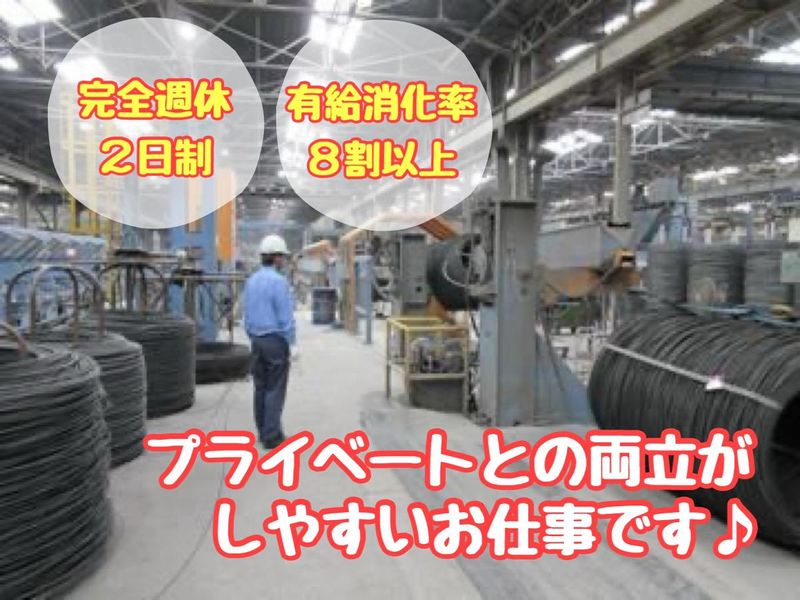 求めている人材 ◆未経験大歓迎 ◆異業種からの転職も歓迎 あなたの生活をこっそり支えてます。 私たちが作り続けているワイヤーロープ。 普段の生活からは見えないですが、実はエレベータや大橋の一部として皆さんの生活を支えてきました。 当社は明治時代からこの事業を続けてなんと130年以上! 今では日本1位のワイヤーロープシェア率を誇る安定企業に成長しました。 この利益をスタッフに還元するため、≪年間休日125日≫と長期連休、年間4ヶ月分の賞与年2回などの 手厚い福利厚生をご用意しています。