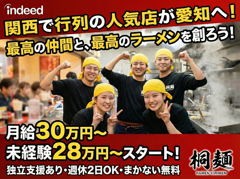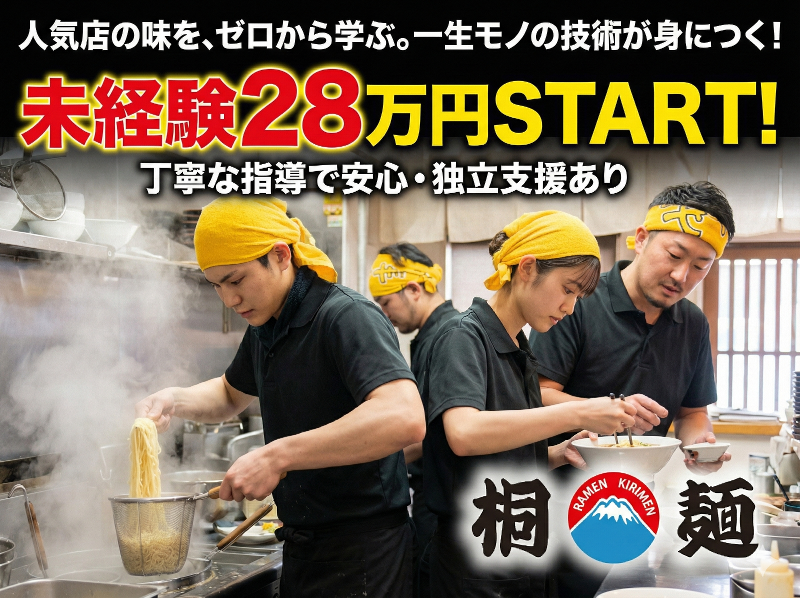 アピールポイント: 『桐麺』を選ぶべき5つの理由 ① 【ブランド力】食べログ百名店の実力 大阪で行列の絶えない人気店のノウハウを、 オープニングメンバーとして直接学べます。 「どこで修行したの?」と聞かれた時、 胸を張れる経歴になります。 ② 【労働革命】スープ作りは本部にお任せ 重労働である「スープの炊き出し」はありません。 熱い・重い・長時間労働の三重苦から解放され、 接客や盛り付け、店舗マネジメントに集中できます。 ③ 【最新設備】i食券機導入 注文聞き間違いのミスや、 レジ締め残業のストレスがありません。 DX化で業務を効率化し、 残業月20時間以内を実現しています。 ④ 【人間関係】フラットなオープニング 「怖い師匠」はいません。 集まるのは全員「1期生」。 未経験の若手からベテランまで、 全員で一緒にお店の文化を作っていくワクワク感があります。 ⑤ 【自由度】髪色・ネイル・ピアス自由 清潔感があれば、オシャレは自由! 「黒髪にしなきゃ…」なんて悩む必要はありません。 あなたらしいスタイルのまま働いてください。