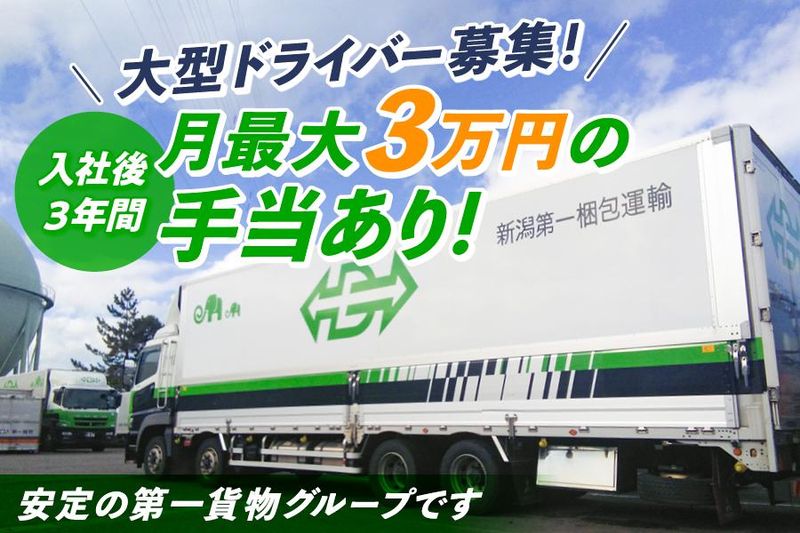 仕事内容 ✤ • • • · ·· ココがポイント ·· · • • • ✤ ✅入社3年目まで、「入社時特別手当」を支給! 中途入社・転職の方も支給対象です! ✅大型ドライバー経験のある方を募集します! 同業他社からの転職も大歓迎♪ お持ちの資格・経験を活かして新しい環境にチャレンジしてみませんか? ✅1人1台の担当車両制! 内装も比較的自由! 自分だけの専用車両で快適に働けます。 ✅働いた分はしっかり還元! しっかり稼ぎたい派はもちろん、休みもしっかり欲しい派の方もご相談ください! ✅免許資格取得支援制度あり。 フォークリフト運転技能者など、全額会社負担で取得できます! ✤ • • • · ·· · • • • ✤• • • · ·· · • • • ✤ <具体的なお仕事> 関東方面への中距離運行を行っていただきます。 積荷は食品・家電商品・日用雑貨がメインで、貸切輸送になります。 積み込みや荷下ろしも担当していただきます。 積み下ろしについては、フォークリフトを使う場合もあります。 ▶使用する車両/10tウイング車 比較的新しい車で、ドラレコ・デジタコ・バックモニター・ベッド完備。 1人1台の担当車両制なので、自分だけの快適空間で働けますよ! ▶運行日数/ 1回の輸送につき2〜3日運行。 身体に負担がないよう休憩はしっかり9時間以上! 月の運行回数は10回程度となります。 \\⭐入社3年目まで、「入社時特別手当」を支給!⭐// 入社1年目 3万円/月 (年36万円) 入社2年目 2万円/月 (年24万円) 入社3年目 1万円/月 (年12万円) 万が一3年以内に退職しても、返金などのペナルティはありません。 また、支給対象者にも制限なし! 中途入社、転職の方も支給対象です! \\⭐働いた分は給与で還元!⭐// 安定した仕事量があるので、「しっかり働いてしっかり稼ぎたい!」という方の希望も叶います。 もちろん、「休みもしっかり欲しい」という働き方も可能◎ ご希望をご相談ください。 <当社について> 山形県に本社を置く第一貨物株式会社の関連会社で、東北や関東エリアを中心にとしたネットワークで 「輸送品質」を大切にした物流支援により、社会の発展に貢献しています。 取扱商品は家電製品や菓子などが多く、安定した仕事量があります。