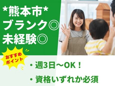 仕事内容 \ここがポイント/ ★熊本県熊本市での保育士・幼稚園教諭・子育て支援員のお仕事! ★実務未経験・ブランクのある方も大歓迎!安心のサポート体制♪ ★土日祝休み!週3日~の勤務も相談可能! *・。・。*・。・。*・。・。* <仕事内容> 保育園や幼稚園での保育士・幼稚園教諭・子育て支援員業務をお任せします。 子どもたちの日常生活をサポートし、 楽しく安全に過ごせる環境を提供します。 具体的には、遊びや学びの支援、 食事やお昼寝のサポート、保護者との連絡など、 子どもたちの成長を見守るお仕事です。 ◎実務未経験やブランクがある方も安心! 柔軟な働き方が可能で、週3日勤務など相談に応じます!◎ *・。・。*・。・。*・。・。*
