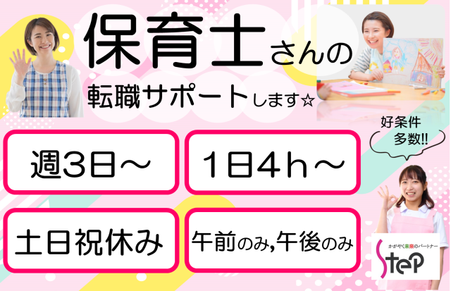 \職場を見学してからお仕事スタート◎/ 時給~1600円 ライフスタイルに合わせて勤務OK☆ 株式会社ステップグランドスタッフ 平日のみ勤務の保育士 ■案件NO,A0005■お電話で案件番号をお伝えください! 保育士さん募集☆ ライフスタイルに合わせて お仕事可能♪ \ここがポイント!/ ◆週3日~ ◆1日4h~ ◆土日祝休み ◆車通勤OK ◆短時間OK ◆16時に退勤 ご希望をお聞かせいただき 求人をご紹介します☆ ____________ 【豊富な取り扱い求人☆】 ・子育て中の方に →16時迄や短時間のお仕事 ・がっつり働きたい方に →フルタイムや宿直のお仕事 ・ブランクのある方に →週3日~OKのお仕事 などなど、ライフステージや 生活スタイルに合わせて お仕事可能です! ____________ 「都島駅」や「大正駅」、 「新加美駅」や「西長堀駅」など 様々な沿線で案件あります! 近隣の松原市や堺市などの 案件のご紹介も可能です♪ ____________ \最短1分でWEB応募完了/ 保育士の資格を有する コーディネーターが あなたのお仕事探しを 全面的にサポート☆ 施設への見学時も同行します☆ 働く上で伝えておきたいこと、 時間の相談などなど ご自身では伝えにくいことも コーディネーターが伝えますので 見学時も安心です♪ お仕事開始後も 継続的にサポートしますので ご安心ください!