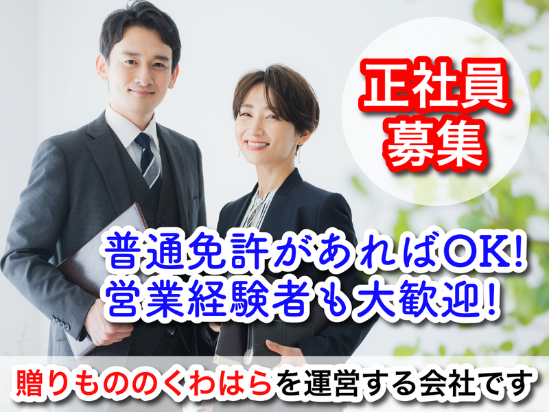 仕事内容 【新着】地域に根差したギフトの提案営業✨ ノルマなし!男性社員が活躍中です! ―――――――――――――――――――― 「贈りもののくわはら」を運営する当社では 誕生日・卒入学・結婚・出産などの お祝い事へのギフトから法事の贈答品、 企業様向けの販促物やノベルティの 企画・提案・制作・販売を行っております。 《主なお仕事内容》 リピーター顧客(法人)を中心に、 ギフトの提案や見積りの提示などの 営業活動をお願いします。 また、電話やFAX・公式HPなどからの 問い合わせに対しての提案対応といったような 新規営業活動もお願いします。 ⏩入社後3~4ヶ月間は、先輩社員に同行! 会社全体としての目標額に向けて、 社員一丸となって業務に取り組みます。 活動報告や、案件の相談・共有ができる ミーティングの場も毎週ありますよ✨