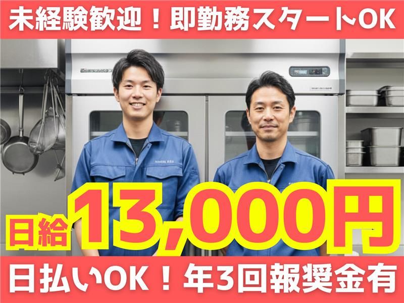 仕事内容 ✨未経験歓迎!✨ ✅研修・教育が充実! ✅日払いOK! ✅報奨金あり(年3回) ✅フルタイム勤務歓迎! ✅正社員登用あり! ||◤ ̄ ̄ ̄ ̄ ̄ ̄ ̄ ̄ ̄ ̄ ̄ ̄ ̄ ̄ ̄◥|| \面接合格後即勤務開始も大歓迎/ \新生活・社会人デビューも歓迎/ ||◣_______________◢|| メーカーの正規設置・メンテナンス業者 として、飲食店やホテル・病院などへ 業務用冷蔵庫などの入れ替え・新設工事や 自社の倉庫整理をするお仕事です! ⏩具体的な仕事内容  ̄ ̄ ̄ ̄ ̄ ̄ ̄ ̄ ̄ ̄ ・業務用冷蔵庫の設置 ・厨房設備に関する簡単な配管工事、配線 ・倉庫整理 ・車両の掃除 ・事務作業 など ⏩簡単な1日の流れ  ̄ ̄ ̄ ̄ ̄ ̄ ̄ ̄ ̄ ̄ ▼出社 ▼当日のスケジュールを確認し 必要なものの積み込み ▼現場作業(1日2~5件) ▼帰社、倉庫整理 ▼帰宅 ✨残業は現場数により発生する場合あり。 時間外は全額支給。 早上がりも日給全額保証。 ✨2~3名のチーム制。 ⏩キャリアアップを目指すのも可能◎  ̄ ̄ ̄ ̄ ̄ ̄ ̄ ̄ ̄ ̄ ̄ ̄ ̄ ̄ ̄ ̄ ̄ ̄ ✨アルバイトから正社員へ! ✨専門スキルを身につけ、資格取得へ! スキルとキャリアの両方を積んでいけます! 前職が引っ越しスタッフや配送ドライバー、 建築・土木作業員や工場スタッフ、 警備員や飲食店スタッフなどの 採用実績があり、どんな方でも活躍可能♪