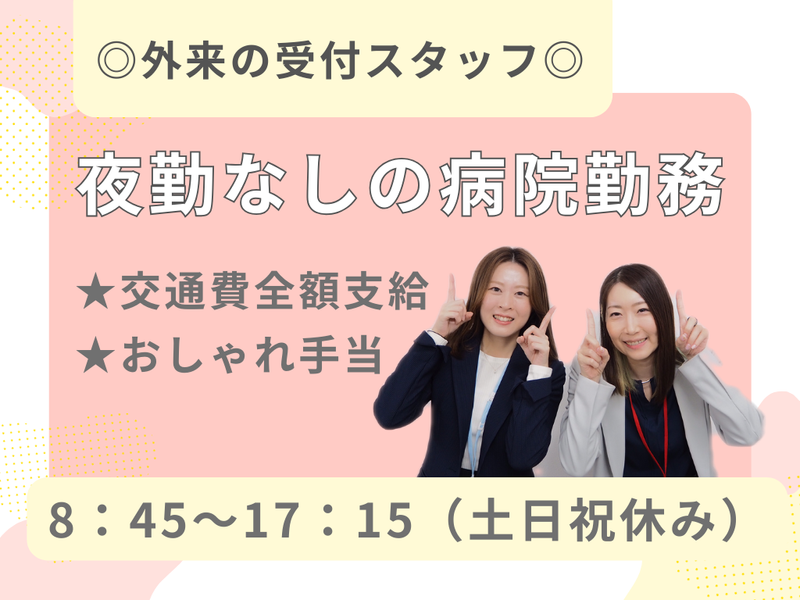 仕事内容 ★外来患者の受付業務★ ・診察券や保険証の確認 ・予約確認や検査のご案内 ・電子カルテの入力 ・精算業務 など 緊急の患者さんや専門的な説明などは正規社員が行いますので、その補助業務をお任せします。 ◇ 交通費全額支給 ◇ 夜勤なし!日勤のみ ◇ 9時-17時の時短も可能 ◇ 土日祝休み♪ \こんな方におすすめ!/ ・病院やクリニックでの経験がある方 ・事務仕事やパソコン操作ができる方 ・子育てから復職する方 ・長期でお仕事したい方 ◎女性活躍リーディンカンパニー認証企業 女性活躍に積極的に取り組む企業として、 「大阪市女性活躍リーディングカンパニー」の最高ランクとなる三ツ星に選ばれました! ◎web面接実施中! 面接は1回のみオンラインで行います。 最短当日面接も可能ですのでお気軽にご相談ください。 ◎おしゃれ手当あり 毎月の美容施術代を会社が負担する、女性に嬉しい福利厚生です! 美容室やまつエクなど… ★ー★ 支給例)月7,500円 月給の4%が支給上限です! (時給1250円×7.5時間×20日×4%) \ご応募お待ちしております/