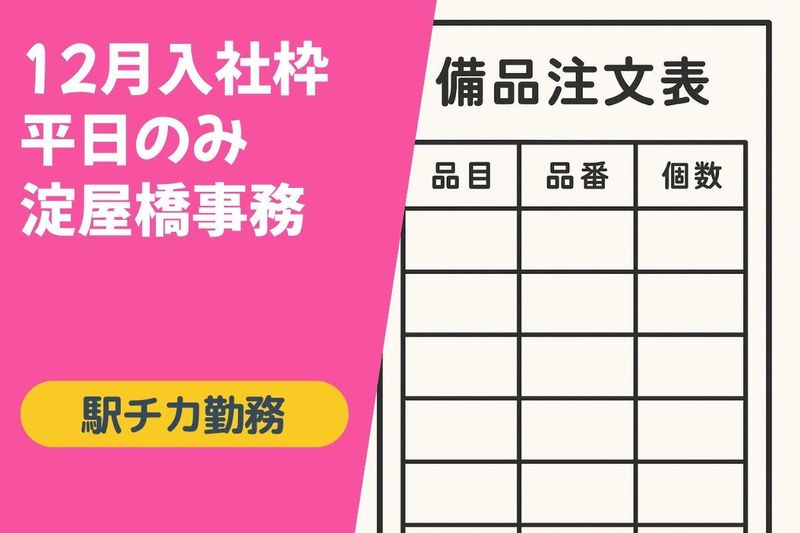仕事内容 <12月入社> ✅土日休み ✅年末年始お休み ✅淀屋橋駅スグ <備品に関する社内対応> ・社内からの備品に関する問い合わせ対応(メール・FAX) ・備品発注・在庫確認 ・関係部署、配送業者との連携 <ココがオススメ!> ・研修&サポート体制万全!オフィスワーク初心者も大歓迎! ・広くてキレイな休憩室あり!ウォーターサーバー、レンジ、鍵付きロッカー、WiFI利用可能 ・服装、髪型、ネイル自由!オシャレを楽しみながら働けます! ・福利厚生や嬉しい設備が充実!働きたくなるポイントがたくさん!