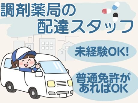 仕事内容 仕事内容 配達業務をお願いします。 配達先としては下記となります。 ●調剤薬局にいらっしゃった患者様のお薬の配達 ●施設への定期薬(臨時薬)の配達 ●店舗間の在庫の配達 ●本部から各店舗への配達 エリアは愛知県内です。 県外の配達は無し! モクモクと働けるので運転が好きな方にはぴったりです! ≪1日の流れ≫ 1.出社 2.配達状況確認 3.配達 ※配達がなければ店舗にて書類整理・薬のセット・ピッキング等の補助作業 4.配達状況・伝達事項報告 5.退社 *適宜1時間休憩 生活に合わせて働けます◎ 週3日・1日4h~OKなので私生活とも両立しやすい環境です! 家事の合間の短時間はもちろん フルタイムでがっつり稼ぎたい方も大歓迎! 週3日~OKなので、お子さんの学校行事によるお休みなど 家庭やプライベートの予定優先OK! 扶養内勤務も可能なので、あなたの希望の働き方を教えてくださいね★