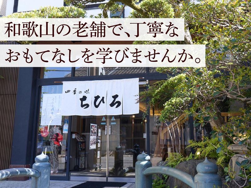 仕事内容 // 和歌山の老舗で、 “一生ものの接客”を学ぶアルバイト \\ ✅未経験&初バイト大歓迎! ✅週3日、1日5h~勤務OK! ✅清潔感があれば髪型・髪色自由 ✅着物で接客&お茶を点てる経験も。 ❖・・・*・・・❖・・・*・・・❖ 「四季の味 ちひろ」は、 和歌山で50年以上続く老舗和食店。 結婚の顔合わせや法事での節目に ご利用いただくことも多く、 たくさんのお客様に愛されてきました。 個室をご予約のお客様が多く、 落ち着いた雰囲気の中で接客できる ため、慌ただしさとは一切無縁です。 ❖・・・*・・・❖・・・*・・・❖ 【仕事内容】 お客様の大切なシーンが 良い時間となるように、素敵な笑顔で おもてなししてくださいね。 ・お客様をお席までご案内 ・ご注文のお伺い ・お料理の配膳 など ※コース料理をご予約の お客様がほとんどです。 +++- ■未経験やブランクのある方でも 安心してスタートできる環境! -+++ 老舗和食店と聞くと、 「厳しそう」「敷居が高そう」と 感じるかもしれませんが、ご安心ください。 ご予約のお客様ばかりですし、 穏やかで品のある方がほとんど。 丁寧な対応を一つずつ学べるため、 未経験の方やブランクのある方にも おすすめなんです! 言葉づかいや所作も一つずつ教えるため、 初バイトでも安心してスタートできます。 安心できる環境で、社会に出てから 役立つマナーを身につけていきませんか? ┏ ━━┅━━━━━┅━━ ┓ ୨[インタビュー]୧ 先輩に聞きました! ┗ ━━┅━━━━━┅━━ ┛ Q. お店を選んだ理由は? A. 着物が制服というのに惹かれました。 お茶を点てる体験などもあったり… 日本の伝統を楽しみながら働けます。 Q. 仕事のやりがいは? A.お客様との距離が近く、 喜びの声が聞けること。 様々なお客様と出会えるので新鮮です! Q. 大変だと感じることは? A.机や椅子の移動に力を使うこと。 お客様の年齢層が幅広く 対応力を身につける迄少し大変でした。 Q. これから応募する方へメッセージ A.日本文化や和の雰囲気が好きな方なら、 楽しみながら働けると思います♪
