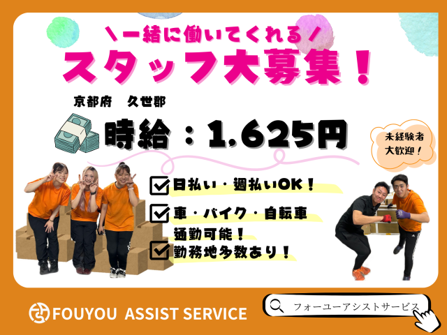 募集要項 職種 雑貨仕分けスタッフ 具体的には・・・荷物に貼ってある伝票に市町村別に設定されている番号を見て、同一番号の台車へ乗せる作業がメインです。 お揃いの制服(買取)でチームワークを発揮して業務に取り組みます! 雇用形態 派遣社員 仕事内容 ぜひ動画で見てみてください! → https://www.tiktok.com/@fas2004kanto 荷物に貼られているラベルを見て、行き先ごとに仕分けたり、台車を指定場所に運んだり! 荷物に貼ってある伝票に市町村別に設定されている番号を見て、同一番号の台車へ乗せる作業です。 番号は3桁の数字で同じ番号の荷物を同一番号の荷物を積んだ台車へ仕分けします。 番号は市区町村ごとに区分けされています。 住所をみて3桁の数字が思い浮かんだら、あなたはもうマスターです!笑 専門知識も必要ありません!! 未経験の方も安心してスタートできます! 現場リーダーが丁寧に研修を行います! 男女活躍中の職場です! #関西#京都府#久世郡#久御山町#宇治市#城陽市#京都市伏見区