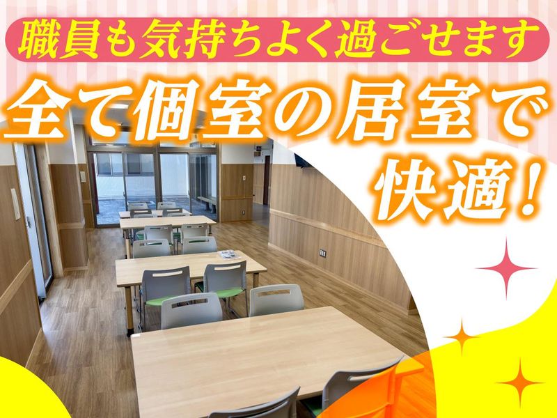 職場環境 全て個室の居室だから、利用者様のプライベートが守られて快適♪ 利用者様・職員共に気持ちよく過ごせる、新築の綺麗な施設です。 看護師専用ルームや休憩室・更衣室と個人ロッカーなど 快適に働ける施設になっております。 喫煙所:喫煙所あり(屋外)