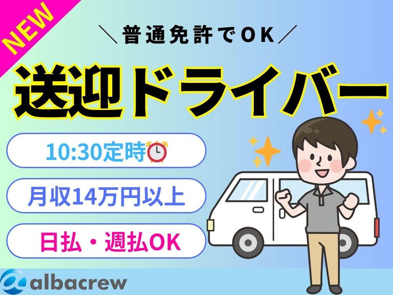求めている人材 【必須条件】 ✅普通運転免許 【歓迎条件】 ✅送迎経験者 「お仕事自体が久しぶり…」 というブランクがある方も 慣れるまで先輩スタッフが 丁寧にお教えするので大丈夫☘ ┏━━━━━━━━━━━┓ ⭐こんな経験活かせます♪⭐ ┗━V━━━━━━━━━┛ 配送ドライバー、送迎ドライバーや 4tドライバー・2tドライバーなどの 中型ドライバーから大型ドライバーまで 様々な経験が活かせます✨ ✧近しい業種の経験として、 幼稚園・保育園送迎ドライバーや 企業送迎バス運転手、運転手、 ツアーバス運転手などで 活躍していた方など 正社員・短期スタッフ、 アルバイト・契約社員、 パート・委託・嘱託など問わず様々な キャリアをお持ちのスタッフが活躍中❗ ◌◍┈┈┈┈┈┈┈┈┈┈┈┈┈┈┈⿻*.· ✅長期歓迎!長く働ける職場✨ ✅扶養内勤務歓迎/扶養控除内OK (扶養内勤務OK)お気軽にご相談ください◎ ✅フリーター歓迎!シフト相談随時OK! ✅Wワーク歓迎/副業OK/ 副業・WワークOKの職場です(・ω・) ✅ブランク歓迎/ブランクOK✨ ✅経験者歓迎/経験者・有資格者歓迎! ✅経験不問/第二新卒歓迎します ✅学歴不問(中卒・高卒歓迎) ✅女性活躍中/女性が活躍中の職場です☘ ✅ミドル活躍中! ✅60歳以上のシニア応援企業 ✅家事・育児経験が役立つ! 今後の生活に活きるスキルを働きながら得られます◎ ✅U・Iターン歓迎 ✅週4日以上OKです! ✅時間固定シフト制で働きやすい♪ ✅月平均残業時間20時間以内⏰ ✅フルタイム歓迎