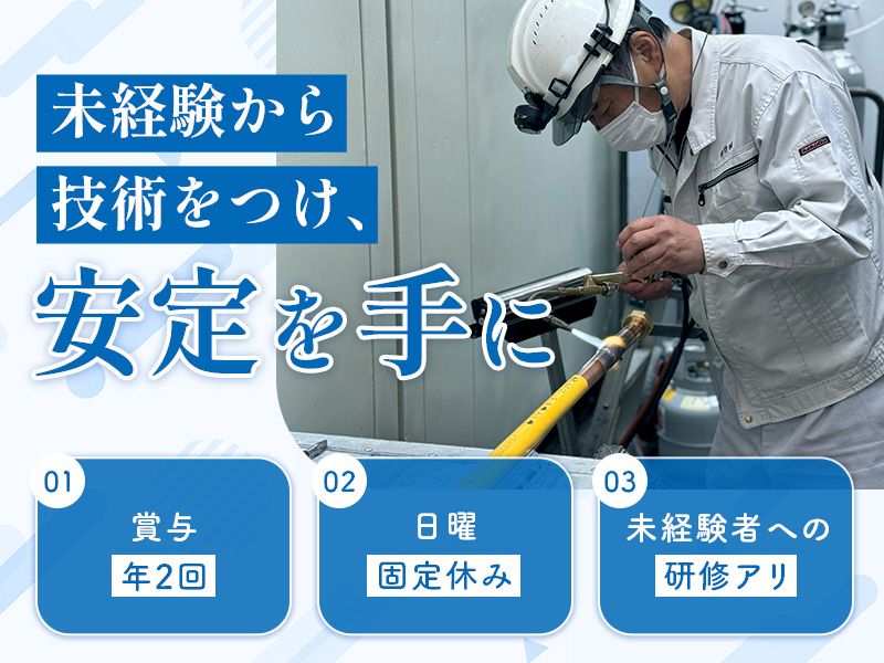 アピールポイント ・-・-・-・-・-・-・-・-・ 【各種手当の充実】 通信手当、熱中症対策手当など 各種手当が充実してるのも魅力。 時短勤務(早上がり)も可能で オフの時間もしっかり充実! 【未経験者へのフォロー体制】 座学および現場見学後に、 OJT研修を行います。 ・最初の1ヶ月: 工具の名前と使い方を習得 ・2~3ヶ月:簡単な配管作業 ・1年後: 先輩の指導のもと一部工事を担当 【基本残業なし】 ・無茶なスケジュールは組みません ・元々担当する工事自体が大きいためスケジュールを組みやすい ・他社の仕事が遅れたとしても こちらが遅れることはありません 【資格取得支援について】 当社には、ガス溶接技能講習や 高所作業車技能講習など、 業務に必要な資格の 取得支援制度をご用意。 もちろん費用は全額負担のため安心♪ ・-・-・-・-・-・-・-・-・ *まだまだ魅力をご紹介* 〇未経験者歓迎 〇研修制度あり 〇各種手当充実 〇賞与あり 〇昇給あり 〇必須資格、条件なし 〇残業ほぼなし