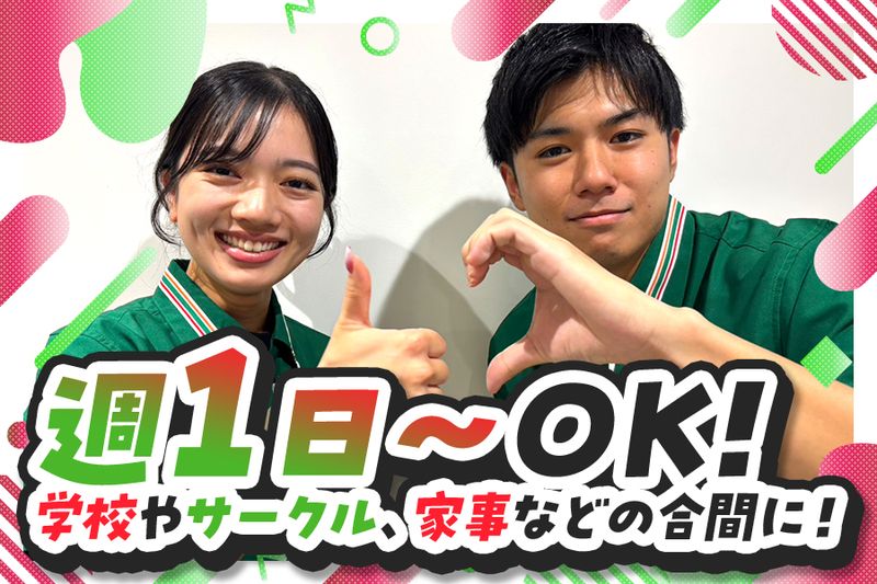 求める人材: <未経験者歓迎!夕勤シフト募集中です♪> 時間を有意義に使いたい方必見! 「プライベートも大事にしたい!」 「夜型なので朝は寝たい!」 「授業終わりで働きたい!」 そんなあなたにこそオススメの求人です! 週1日から勤務OKだから、 柔軟に予定を立てられますよ! シフトはお気軽にご相談ください◎ \皆さん歓迎中!/ 学生さん/フリーターさん/Wワークさん/ 高校生さん/主婦(夫)さん など… ※接客レベルの日本語を話せる方 (業務で必要なため)