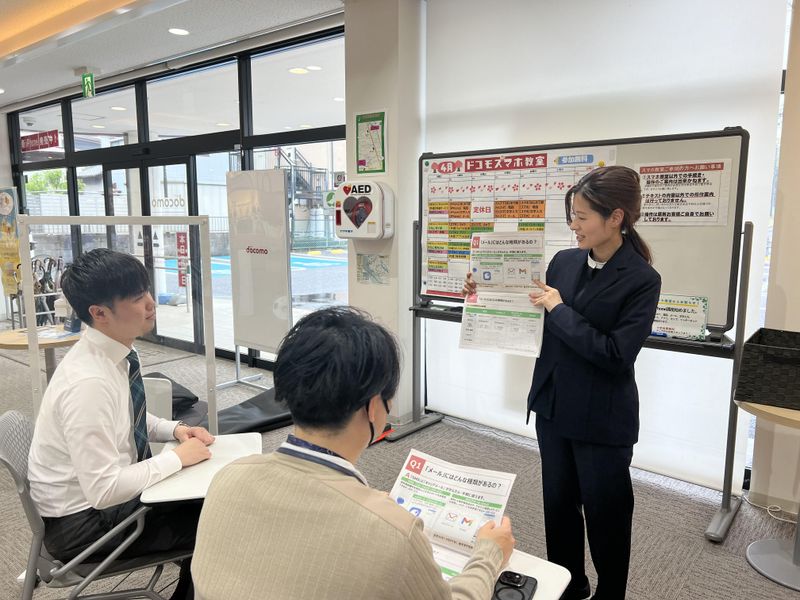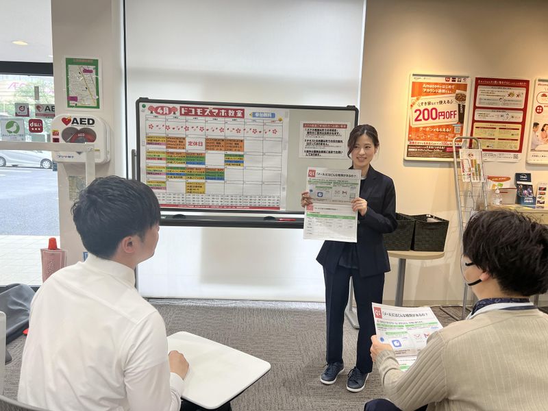 仕事内容 \ 『年内に仕事決めたい方』歓迎!! / *-* ”年内の応募”で ▶1月上旬、中旬ごろから勤務できる! *-* ✅未経験スタート大歓迎✨主婦活躍中 ✅週2日~&スキマ時間で働ける! ✅平日のみ or 土日のみ勤務が可能です ✅急な早退も応相談◎柔軟に対応♪ ✅操作マニュアル・テキスト完備! - docomoのスマホ教室で、 スマホの基本的な操作方法を お教えするサポートスタッフ! シニア世代の方や、 スマホ操作が苦手な方に対して メールの送り方やカメラ操作、 アプリの使い方などを 教えていきます。 《その他にサポートする内容》 ・アカウント設定 ・データ移行 ・フィルム貼り付け ・アプリの設定 など 1回の開催で1人~5人ほどの方が 来店されます。予約制だから、 いきなり人が増えたりすることもなく安心♪ お客様には基本的にマンツーマンで テキスト読み上げ・説明していきます! - \マニュアルを見ながらサポート!/ 写真付きの操作マニュアルを見ながら 教えられるので、未経験者も安心! 解説テキストも多数あるので、 自信を持って解決策をお伝えできます✨ 入社後は新人研修もあるので、 説明方法なども事前に学べます! \シフトの柔軟性はバツグンです★/ スタッフが働ける日に合わせて 教室の予約を募集します! 急な出勤をお願いすることがないので、 ご家庭やプライベートを優先したい方に ピッタリです♪ お子さんの学校行事や 急な体調不良での早退なども、 気軽にご相談くださいね。 《シフトの組み方》 働ける日時を提出(1ヶ月毎) ▼ 出勤予定日で教室の予約を募集 ▼ 働ける日に組まれた教室で勤務♪