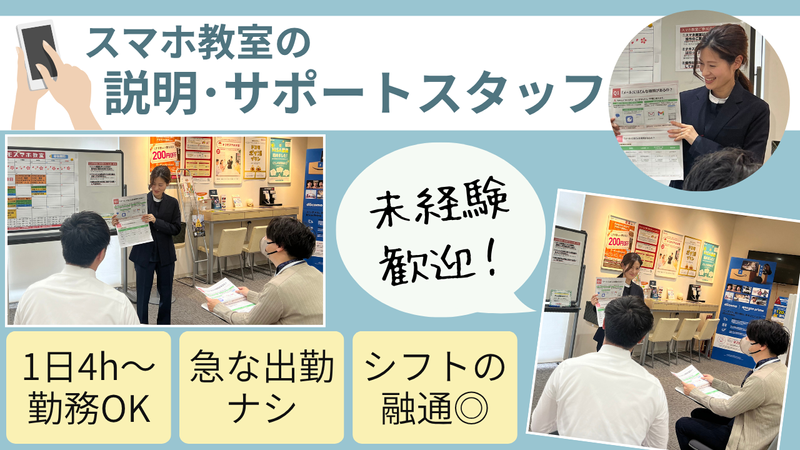 仕事内容 \ 春から新しいお仕事始めませんか? / *-* 「新生活に合わせて働きたい」 「春から少しずつ仕事復帰したい」 そんな方にピッタリのお仕事です♪ *-* ✅未経験スタート大歓迎✨主婦さん活躍中 ✅週2日~&1日4h~スキマ時間でOK ✅平日のみ or 土日のみ勤務OK ✅急な早退・お休みも柔軟対応◎ ✅マニュアル完備で安心スタート - docomoのスマホ教室で、 スマホの基本的な操作方法を お教えするサポートスタッフ! シニア世代の方や、 スマホ操作が苦手な方に対して メールの送り方やカメラ操作、 アプリの使い方などを 教えていきます。 《その他にサポートする内容》 ・アカウント設定 ・データ移行 ・フィルム貼り付け ・アプリの設定 など 1回の開催で1人~5人ほどの方が 来店されます。予約制だから、 いきなり人が増えたりすることもなく安心♪ お客様には基本的にマンツーマンで テキスト読み上げ・説明していきます! 「ありがとう」と直接言ってもらえる やりがいのあるお仕事です♪ - \マニュアルを見ながらサポート!/ 写真付きの操作マニュアルを見ながら 教えられるので、未経験者も安心! 解説テキストも多数あるので、 自信を持って解決策をお伝えできます✨ 入社後は新人研修もあるので、 説明方法なども事前に学べます! \春からの働き方にもピッタリ♪/ シフトは1ヶ月ごとの自己申告制! 「子どもが学校に行ってる間だけ」 「春から少しずつ仕事復帰」 そんな働き方もOK◎ 無理なくスタートできる環境です✨ お子さんの学校行事や 急な体調不良での早退なども、 気軽にご相談くださいね。 《シフトの組み方》 働ける日時を提出(1ヶ月毎) ▼ 出勤予定日で教室の予約を募集 ▼ 働ける日に組まれた教室で勤務♪