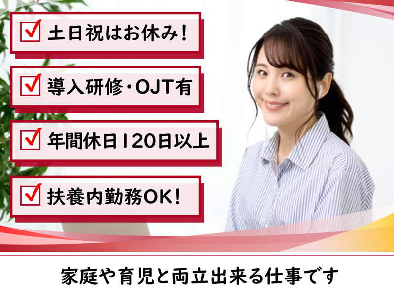 仕事内容 *・。*。・*・。*。・*・。*。・*・ ✨未経験・ブランクがある方歓迎! PCを使った文字入力・コピペが出来ればOK! ✨業務はマニュアルに沿ったルーティンワーク中心 「次はどうすれば?」と迷うことなく進められます ✨導入研修・OJTなどフォロー体制充実 ✨始業時間・勤務時間・日数が選べる柔軟シフト♪ 子どものお迎えに間に合わせることが出来ます◎ ✨平日のみ勤務の土日祝休み!残業なし♪ ✨家庭や育児と両立可能!女性・主婦さん活躍中♪ ✨扶養内勤務や週4日勤務も可能! *・。*。・*・。*。・*・。*。・*・ ✅仕事内容 当社保険金サービス部門で、一緒に働く社員さんの サポートを行う庶務業務をお任せします。 業務の1つひとつはシンプルですが、 当社の営業担当をはじめ、お客様の安心へと 繋がっていく、実感の持てるお仕事です。 【具体的な業務内容】 ◆社内のメール対応や電話の取次対応 ┗やりとりの相手はほとんどが社内の方。 安心して対応することが出来ます◎ ◆書類の受付・仕分・ファイリング ◆郵送物や社内便の発送準備 など 《仕事内容についてのPOINT》 *業務マニュアル完備、ルーティンワーク中心♪ *入社前に保険に関わる知識・経験は不要♪ ※保険加入・販売等のノルマは一切ありません ✅選べる働き方 始業時間は【9:00~/9:30~/10:00~/10:30~/11:00~】から選択可能 実働時間は【4時間〜6時間】で調整可能 ※お昼休み1時間あり 勤務日数は【週5日】または【週4日】(平日のみ) 扶養内勤務も相談OK! 土日祝休みでプライベートも大切にできます♪ \社員の声をご紹介/ ●入社4年目/38歳/女性 始業や勤務時間がフレキシブルなので、 子どもの保育所への送り迎えや急な体調不良にも対応でき、 育児と仕事の両立ができるのが嬉しいです! 一緒に働くメンバーや上司も育児経験者が多く、 子育てに理解があるため、明るくフォローしあう環境で働きやすいです♪ ●入社2年目/29歳/女性 勤務時間の調整ができ、残業もゼロなので、 平日勤務後の時間を有効活用できるようになりました! もちろん休日もしっかり休めるので、前職と比べて ワークライフバランスが改善し、毎日充実しています♪