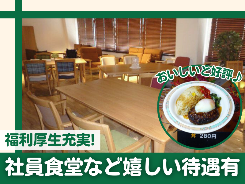 【保険制度】 雇用保険、労災保険、健康保険、厚生年金 待遇・福利厚生 【福利厚生】 ◆昇給 ◆賞与 ◆車通勤OK(駐車場あり) ◆交通費規定支給(月4万5000円迄) ◆社会保険完備 ◆有給休暇 ◆正社員登用あり ◆社員食堂あり(300円~500円程度) ◆制服貸与
