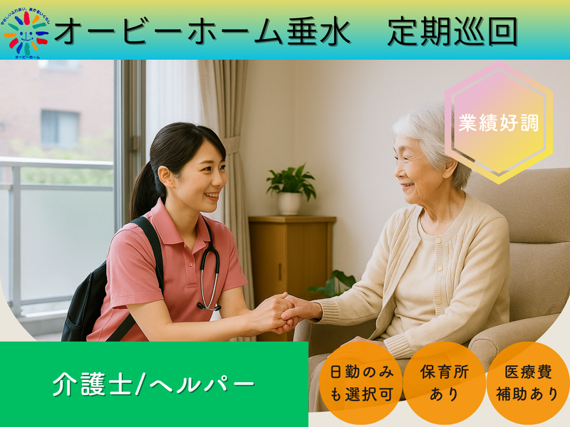 仕事内容 ☆。。。☆オービーホーム 垂水定期巡回 介護士・ヘルパー(正社員・準社員)募集 ☆。。。☆ * 社会福祉法人丸(オービーホーム)が募集する正式な求人です * 【定期巡回とは?】 1回10分~20分の短時間で安否確認、服薬介助、着替え、食事、排泄、移乗・移動、買い物等の訪問を中心に1日の間に複数回、同じご利用者の自宅に定期的に訪問します! ご利用者には必ず訪問看護との連携がありますので、何かあればすぐに看護師に相談できる環境が整っています。 ※最初は先輩スタッフが同行しますので、介護経験はあるけれど訪問は未経験と言う方も安心です。 ※訪問には社有車(軽自動車、原付)を使用します。 ・従事すべき業務の変更の範囲あり:法人の定める業務 ・転勤の可能性あり:転勤範囲 法人内(神戸市垂水区・須磨区) 【おすすめポイント】 ・夜勤なし、日中のみの勤務選択も可(準社員) ・お買い物、外出付き添いなど生活援助の仕事も多く施設介護と比べると体力的な負担は軽め ・ご利用者様と家族様との関わる機会が多いためコミュニケーションが取りやすい ・訪問先が限定されるため道に迷うことはほぼない 【仕事の流れ(一例】 8:00 申し送り・1日の訪問利用者のスケジュール確認 8:10 訪問へ出発 ◯午前中に多い依頼◯ ・お電話でお薬を飲んでいただくよう連絡する ・今日のお買い物は何が良いかお伺いし、お買い物したものをお届けする ・おむつパットの交換 移動の合間に車内でケア記録を入力! 13:00 事務所に戻りお昼休憩してリラックス、他のスタッフも事務所に戻って来るので情報共有! 14:30 午後の訪問へ出発 ◯午後から多い依頼◯ ・おむつ、パット交換など 合間イレギュラーな依頼があれば状況に応じて訪問 16:00 帰社 ケアを記録し1日の振り返りと遅出の勤務者への申し送り 17:00 残業ほぼなしで退社! 【夜勤のお仕事は?】 事務所で待機、専用機器のコール対応をします。 コールがならなければ事務所で過ごすことができるので施設介護に比較すると落ち着いて勤務できます 深夜・早朝のコールの多くは電話対応のみでご利用者様も安心していただけることが多いです 夜間に転倒してしまった!などコールがあれば急いで訪問する場合もあります