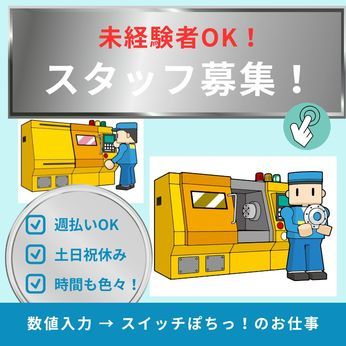 仕事内容 金属の板材を加工する機械OPスタッフ スマホに使われるような 金属板の【カット・加工】のお仕事 扱うものの大きさは、サイコロサイズ~大小さまざま。 はじめは伝票の仕分けだったり、 ピッキングなどの軽作業からスタート! 【メインのお仕事】 ・材料をセット → 機械のボタンを押す!たったこれだけ! その他、付随する業務もお願いします。 ※業務の流れなどはトレーナーが付くので安心! ・即日勤務OK ・週払い可(規定有) ・シフト多数、勤務時間は相談OK ・土日祝はお休み(休日出勤は基本なし) ・車、バイク、自転車通勤OK(無料Pあり) 他にも待遇複数あり!詳しくは、待遇欄をぜひご覧ください!! ※未経験の方も安心して働けます。 ※残業1~2時間/日程度あり ■未経験スタートでも働きやすい! 当社入社の方はほとんどが未経験からスタート♪ 長~く働ける職場で安心♪ 製造経験ある方も歓迎中です! ■その他 採用管理担当者も全員、派遣現場で業務経験あり! 派遣のお仕事が初めてでご不安な時はお気軽にご相談ください! ■この仕事の特徴 髪型・髪色・服装自由・週払いOK コツコツとした作業が得意な方にぴったりです!