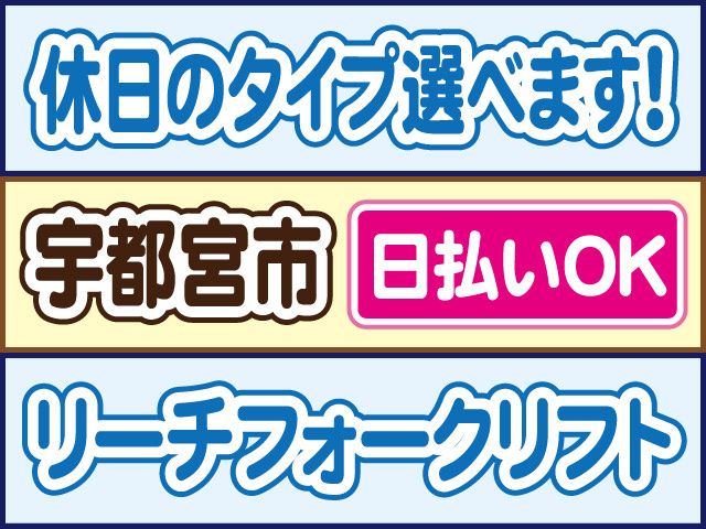 【宇都宮市/履歴書不要】倉庫内フォークリフト作業 資格・経験活かせます!休日のタイプ選べます!