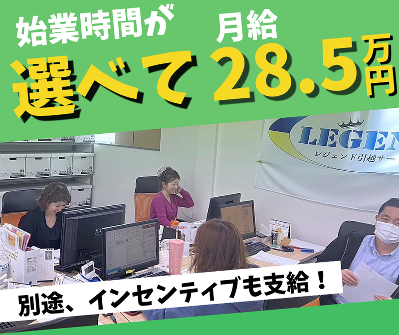 仕事内容 【年間休日105日】 【朝9時または10時のスタートが選択OK】 【新卒者や第二新卒者大歓迎!】 【ブランクのある方もOK!】 お客様に寄り添いながら、『お引越し』という新たな一歩を踏み出す ライフイベントのサポートをお願いします。 【お仕事内容】 1)引っ越しの比較サイトよりお問合せの有ったお客さまへ当社をご利用頂けるようにご連絡をします。 2)お電話で直接、いつの引っ越し予定なのかを確認し、現在のお部屋の大きさやお荷物の多さをヒアリングしていきます。 ・ヒアリングする項目の通りお話を進めていきます。 ・ヒアリング内容は、マニュアル化されていますので、ご安心ください。 ・また、お客様からのお問合せのなどにも細かくお応えしていきます。 ・当社からの質問にも丁寧にお答えいただけ、お仕事を進める上では、ストレスも感じないのも特徴です! ・ここまでは、パートスタッフの方でも行って頂ける内容なので、全く難しくなく進めて頂けます。 3)実際に具体的な内容を確認した上で、お見積書の作成を行っていきます。 ・始めは、先輩スタッフがマンツーマンでフォローを行っていきますので、少しずつ理解を深めていってください。 4)お見積書の作成が完了しましたら、お客さまにお見積書のご提示を行っていきます。 ・細かなヒアリングを行うことで、成約率も大きくアップしていきます。 5)お客さまからのご依頼が有って、書類の確認などを行い、次の工程のスタッフにバトンタッチし終了です! ・PCを使ったヒアリング入力や伝票入力などの業務も有ります。 ・入社後は、まずはスキルに応じたお仕事からお願いします。 ・伝票入力や見積書・請求書作成は、PCで専用のソフトに入力するだけでOK! だから、ワードやエクセル等のスキルがない方も大丈夫ですよ! ・まずは環境に慣れることからスタートしましょう♪ ・電話の取り次ぎ方や伝言など、少しずつステップアップしながら成長していってくださいね! 【アピールポイント】 お引越しをしたことが無い方でもスグにコツを掴んでいただける内容です。 また、お引越し経験をお持ちの方ならば、更にスムーズな対応ができるはず! どちらにしても先輩スタッフが、丁寧に基本からお教えします! (基本的にルーティンなので、スグに馴染めるはずです!)
