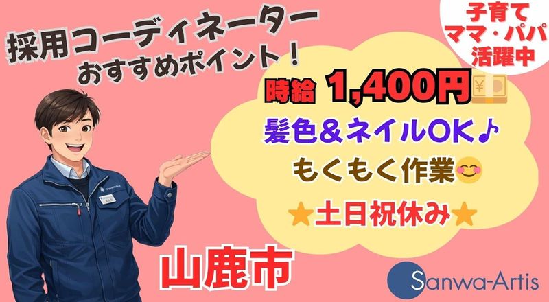 選考プロセス ―――ご登録について――― ① オンライン登録 スマホやタブレット、PCがあればいつでも登録ができます。 ※履歴書は不要です。 ② サンワアルティス事務所での面談登録 住所▶熊本県菊池市泗水町吉富205-4 ①または②のいずれかを選べます。 どちらも事前予約が必要となります。 ご希望は採用窓口までご連絡ください。 <採用窓口> TEL▶0120-880-889 【派遣元責任者より】 本日は数あるお仕事の中から、サンワアルティスの求人をお読みいただき、誠にありがとうございました。 お仕事条件はご希望に沿う内容でしたでしょうか。 また、わかりづらい表現などはございませんでしたでしょうか。 少しでも不安な点やご応募前に確認したい点などございましたらどうぞご遠慮なくお問い合わせください。 このお仕事(本求人では)は情熱あふれるコーディネーターが、あなたの専属担当としてご希望条件のヒアリング、職場見学、お仕事開始後のお悩み相談を責任もってご対応いたします。 最後になりますが、本日はご閲覧いただき誠にありがとうございました。 心より御礼申し上げます。 派遣元責任者 派遣サービス部 次長 穴井 雄輔 080-8560-7040