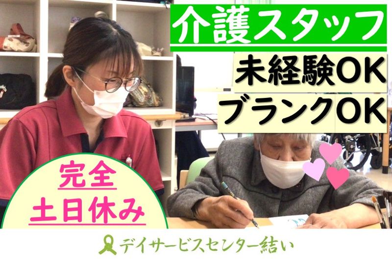 【仕事内容】 介護経験の少ない方やブランクある方も活躍中!新卒の方、第二新卒の方も活躍中です! 完全週休二日制(土日休み)のため、週末の予定も立てやすく、ワークライフバランスの整った働き方ができます! 軽介護度のご利用者様が多く、いつも楽しい会話と笑顔でいっぱいの施設です。昇給やキャリアパス制度も整っているので、頑張った分収入もUPします。 ■具体的なお仕事内容 ・トイレや入浴、食事介助 ・レクリエーション実施 ・介護記録 など ※ご利用者様とのコミュニケーションも大切なお仕事です。 ■コンセプトについて 「デイサービスセンター結い」には、住み慣れた地域の中で自分らしい毎日が送れるように、地域や家族・大切な人との結びつきを、結いに通うことで叶えていただきたい。そんな思いが込められています。 「自己決定」と「自己選択」をコンセプトに、利用者様お一人おひとりに自分らしい時間と生きがいを見つけていただけるようサービスのご提供をしております。 ■笑顔で溢れた施設です。 利用者さんから「いつもありがとう」「あなたと話せるのが楽しい」と言って貰える最高の仕事です。 ご利用者様に、結いに来ることが「楽しみ」、結いでの活動が「生きがい」、結いに通っているのが「自慢」そう言っていただける施設を目指しています。 ■未経験・ブランクある方も活躍中! 未経験の方や経験が浅い方も、積極的に採用!人物重視の採用をさせていただいています。 今いるスタッフも介護施設未経験のメンバーが多く活躍しています。 いきなりの応募は不安な方も、まずは施設見学からしてみませんか? 働き方や、条件に関するお問合せも、ぜひご連絡ください。