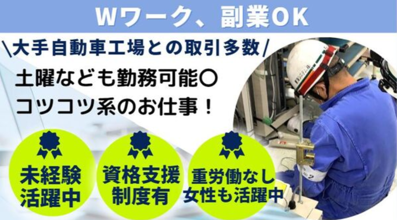 仕事内容 【お電話でのご相談お気軽にください!】 電話:052-601-8591 です! お仕事の詳細を聞きたい方、応募に悩まれている方 まずはお気軽にご連絡ください♪  ̄ ̄ ̄ ̄ ̄ ̄ ̄ ̄ ̄ ̄ ̄ ̄ ̄ ̄ ̄ ̄ ̄ *土曜日の週1日のみでもOK! _________________ 自動車工場のメンテナンスの仕事です。 といっても自動車整備士ではありません。 自動車を生産する機械は、 定期的にメンテナンスしないと故障に繋がります。 大きな故障に繋がる前に、「潤滑油」の分析・管理をしたり 日常的に清掃などの手入れをすることで、大きな手間なく 工場の安定稼働に貢献しています。 このお手伝いを、 皆さんにぜひお願いしたいです! 設備の清掃作業や 潤滑油の交換作業がメインになるので、 未経験の方でも大丈夫。 30代から50代まで、 幅広い年代の方が活躍しています! もちろん、男性・女性も問いません。  ̄ ̄ ̄ ̄ ̄ ̄ ̄ ̄ ̄ ̄ ̄ ̄ ̄ ̄ ̄ ̄ ̄ *チームで仕事をするので安心* _________________ 作業は3~4人のチームで行います。 ベテランから若手まで幅広い年代の方がいますし、 「週1日だけ」だからスキルも様々です。 そんな仲間だから質問もしやすく、 「工場で働くのは初めて」という方でも安心です。  ̄ ̄ ̄ ̄ ̄ ̄ ̄ ̄ ̄ ̄ ̄ ̄ ̄ ̄ ̄ ̄ ̄ *実は安定企業なんです* _________________ 東海システムは1979年創業の会社。 大手自動車メーカーの関連会社様を中心に、 地域に根差した事業活動を行っています。 これまでの実績が評価され、業績も好調。 今回も事業拡大に伴う新メンバーの募集になります。 まじめな人がちゃんと評価される会社です。 そんな環境で、あなたも一緒に働いてみませんか。