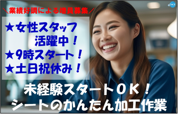 PR・職場情報 =====ここがポイント===== ■未経験スタートOK! ■女性スタッフ活躍中! ■業績好調につき増員募集! 3名急募!お友達との応募OK! ■重量物なし!工場内での軽作業! ■嬉しい土日祝休み♪ ==================== ▼安心のフォロー体制▼ 就業してからも当社営業スタッフがしっかりフォローしますので、派遣が初めての方や未経験のお仕事に不安のある方も安心してお勤めいただけます!! 20代~40代の年代の方が大活躍中!お仕事内容の問い合わせだけでもお気軽にどうぞ! 求人の特徴 【お仕事開始までの流れ】 STEP1: 営業社員との面談、登録 STEP2: 職場見学 STEP3: 入社書類取り交わし STEP4: お仕事開始 ※平日18時以降の面談やオンライン対応も可能です。ご希望の方は遠慮なくお問い合わせください! - この求人以外に派遣・バイト・アルバイト・パートや軽作業、製造、事務 のお仕事に興味のある方、短時間、短期・長期歓迎です。 上越市、糸魚川市、妙高市でお仕事をお探しの方、 未経験、ハローワークでお探しの方もお問い合わせください。 - 〒943-0805 新潟県上越市木田2丁目1番1号 7F-2 株式会社 NCI 上越支店 T E L:025-530-7272 F A X:025-530-7283 freedial:0120-62-2011 (※お電話にてご応募の際は「求人サイトを見て」とお伝えください!) 一般労働者派遣事業許可番号:派07-300732 職業紹介事業許可番号:07-ユ-300310 kyo 求人ポイント 交通費支給,即日勤務OK,主婦・主夫歓迎,長期,フリーター歓迎,バイク通勤OK,給料前払いOK,学歴不問,車通勤OK,残業月20時間以内,平日のみOK,転勤なし,未経験者歓迎,リモート面接OK,研修あり,社会保険完備,制服貸与,ブランクOK,育休制度あり,U・Iターン歓迎,家庭都合休OK,禁煙・分煙,長期休暇あり,40代以上応募可,第二新卒歓迎,産休制度あり,週5からOK,産休・育休取得実績あり,固定時間制