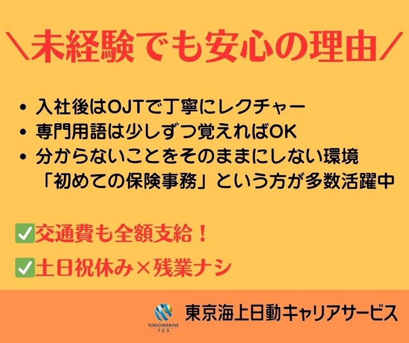 アピールポイント: 【未経験OK】営業事務(損害保険に関する事務サポート) ★事務デビュー・損保事務デビューしたい方にオススメ! ★専用システムへの入力が中心で安心♪ このお仕事のポイント ・未経験スタート歓迎 ・保険の専門知識は入社後に学べます ・損害保険募集人資格は入社後の取得でOK ・営業ノルマ・飛び込み・新規開拓はありません ・データ入力や書類作成など、コツコツ進める業務が中心 ・「事務経験を積みたい」「長く安定して働きたい」方にピッタリ お仕事内容(営業を支える事務サポート) 営業担当やお客さまを、オフィス内から支える事務のお仕事です。 最初からすべてをお任せすることはありません。 できるところから、少しずつ覚えていけば大丈夫です。 ✅保険に関する事務手続き ・保険の申込、更新、内容変更などに必要な書類作成 ・決まったフォーマットへの入力が中心 ・専用システムを使用したデータ入力 ・契約内容の確認や、更新時期のチェック ※難しい判断や説明は営業担当が行うので安心です ✅電話対応(受ける電話が中心) ・既存のお客さまからのお問い合わせ対応 ・「住所を変更したい」「契約内容を確認したい」など ・マニュアル完備&先輩のフォローあり ・分からない場合はすぐに取り次ぎOK ※無理な案内や売り込みはありません ✅ 庶務業務・オフィスサポート ・書類の受付・発送・仕分け ・ファイリングや書類整理 ・備品管理(文房具など) ・来客時の一次対応 ・ラベル作成、簡単なPOP作成など ✅資料作成・データ入力 ・Excelなどを使用した入力作業 ・データの修正・更新 ・グラフ作成などは基本ありません ※基本操作(入力・保存)ができればOK 職場環境について ・勤務時間:9:00~17:00(休憩1時間) ・残業ほぼなし/定時退社も可能 ・少人数の落ち着いたオフィス ・職場メンバー:7名 ・質問しやすく、丁寧に教える風土あり ・長く安定して働いているスタッフ多数 未経験でも安心の理由 ・入社後はOJTで丁寧にレクチャー ・専門用語は少しずつ覚えればOK ・資格取得も入社後で問題ありません ・分からないことをそのままにしない環境 ・「初めての保険事務」という方が多数活躍中 よくある質問(Q&A) Q:本当に未経験でも大丈夫ですか? A:はい、大丈夫です。教えてもらえるので未経験OKです。 Q:保険の知識がまったくありませんが問題ないですか? A:問題ありません。入社後に業務を通して自然に身につきます。資格も入社後に取得していただければOKです。資格取得のサポートはあります!安心してください。 Q:損害保険募集人資格は必須ですか? A:入社時点では不要です。必要になったタイミングで会社のサポートを受けながら取得していただきます。 ✨損害保険募集人資格について(未経験でも安心) このお仕事では「損害保険募集人資格」という資格が必要になりますが、未経験の方でも無理なく取得できる資格なのでご安心ください。 損害保険募集人資格は、保険を扱う業務を行うための基礎的な資格です。 専門学校や難関試験のようなものではなく、実務に沿った内容が中心で、保険の基本的な仕組みや、お客さま対応で気をつけるポイントなどを学びます。 試験はマニュアルやテキストに沿った内容から出題されるため、きちんと学習すれば合格しやすいのが特徴です。 実際に、事務未経験・保険知識ゼロから取得している方が多数います。また、資格は入社後に取得していただければOK。 業務を少しずつ覚えながら学べるため、「いきなり勉強だけ」ということはありません。会社や先輩がしっかりサポートする環境が整っているので、無理なくステップアップできます。「資格」と聞くと難しそうに感じるかもしれませんが、 事務職として働くためのスタート資格という位置づけなので、 これから事務スキルや専門知識を身につけたい方にぴったりです。 Q:電話対応が不安です。 A:最初は取次ぎや簡単な確認が中心です。マニュアルもあり、困ったときは先輩がすぐフォローします。 Q:残業は多いですか? A:残業はほとんどありません。業務が落ち着いている日は定時退社が可能です。 応募について ・【ご来社不要】 ・ご自宅からリモートでかんたん登録 ・履歴書不要の場合あり ・少しでも気になった方はお気軽にご応募ください♪