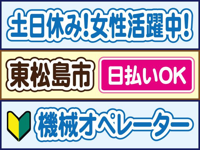 仕事内容 急募、カンタン操作の機械オペレーター募集 未経験OK、稼げる2交替・土日休みの週休2日 安くて美味しい食堂があって便利な職場です 20代~40代の女性活躍中。長期安定 【機械オペレーターのポイント】 〇未経験OK 〇鳴瀬奥松島ICから車3分 〇大郷町・美里町・松島町エリアからも好アクセス 〇給与は8時間分を支給 〇産休育休制度あり 〇定期健康診断あり 〇教育訓練あり(e-ランニング) 〇2交替(日勤 or 夜勤希望の方は要相談) 〇土日休み(週休2日制) 〇ブランクのある方もOK 〇20代・30代・40代の女性活躍中 〇シニア・中高年活躍中 〇日払いOK(規定内) 〇職場見学OK(30分~1時間程度) 〇履歴書不要 【機械オペレーターの仕事内容】 東松島市川下内響にある大手工場でのお仕事です。 作業は半導体部品を製造する 機械のオペレーターになります また、未経験でもすぐに覚えられる作業です 職場の雰囲気も良く、 チームワーク重視の社風があるので、 みんなで協力して作業を行っています 【勤務について】 〇2交替(日勤 or 夜勤希望の方は要相談) 〇土日休み(週休2日制) 急な発熱・体調不良・冠婚葬祭など、 突発的なお休みに柔軟に対応しております。 【経験活かせます!】 〇工場内作業パート・アルバイト 〇工場内軽作業パート・アルバイト 〇組立作業 パート・アルバイト 〇機械オペレーター派遣社員 〇機械操作パート・アルバイト ブランクある方もOKです 工場内での製造や機械のボタン操作などの 経験を活かして働けます! コーディネーター・定着支援のWサポート体制導入 「マイリク定着支援」導入企業! アンケートで職場の様子を確認し、 コーディネーター・定着支援担当が連携してサポート。 はじめての派遣でも安心して働けるよう迅速かつ 丁寧にサポート対応いたします。 ご不明な点はお気軽にお問い合わせください。 お電話でのご応募、ご質問も受付中! 株式会社ロフティー 仙台支店 TEL022-352-5330(採用担当まで) TEL0800-222-6888(フリーダイヤル) 求人情報はコチラ https://entori.jp/lofty-sendai