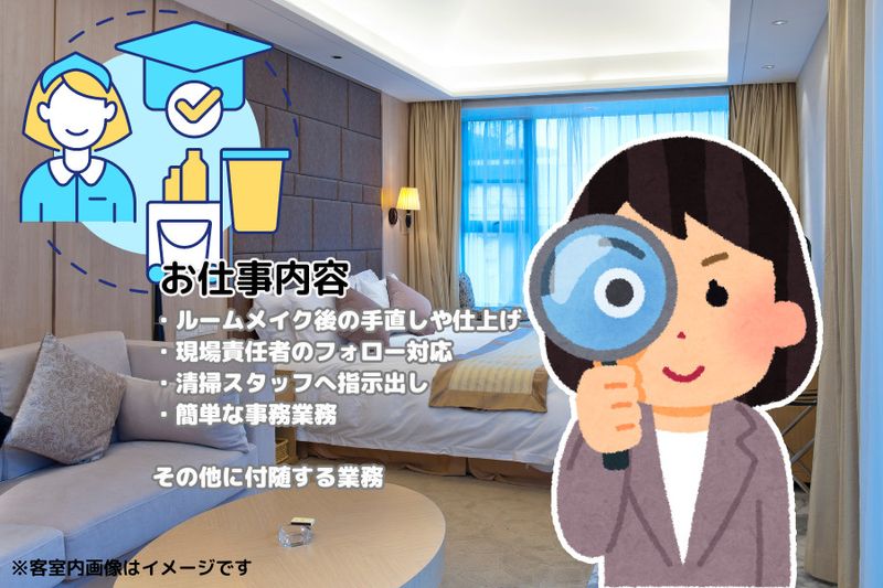 【仕事内容】 ▼客室清掃の最終チェックをお願いします! ―――――――――――――――――――― ✨未経験者に特におすすめ✨ 清掃員がきれいにしたお部屋の不備がないか 最終チェックを行っていただきます。 チェック業務なので身体の負担が少なく、 未経験者の方に特におすすめです! 【具体的には】 ・ルームメイク後の手直しや仕上げ ・現場責任者のフォロー対応 ・清掃スタッフへ指示出し ・簡単な事務業務 その他に付随する 業務もお願いします。 まずは一週間ほど清掃の仕事の流れを学んでいただき、 その後に点検業務をお願いします。 わからないことがあっても 先輩スタッフがフォローします! ✅留学生活躍中 中国、ベトナム、フィリピン、 スリランカからの留学生が活躍中の現場です♪ マニュアル整備も進めており、 働きやすい環境整備に取り組んでおります! 少しでも興味がございましたら ご応募、ご連絡下さい。 お待ちしております。 【求人ID-A0020-1】