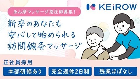 PR KEiROW鎌ヶ谷ステーションで、 正社員のあん摩マッサージ指圧師を募集中 ◎安定したHITOWAグループ運営 (「おそうじ本舗」「イリーゼ」「太陽の子」などを展開) 安心して長く働ける環境です。 ・残業ほぼなし ・土日祝休みOK ・通勤30分圏内も可 ・時短勤務・Wワーク相談OK ・退職金制度あり 「しっかり稼ぎたい方」も「無理なく働きたい方」も大歓迎。 あなたのライフスタイルに合わせた働き方を一緒に見つけましょう 【KEiROWとは】 全国325拠点を超える訪問マッサージブランド。 2002年に東京で直営を開始し、2013年よりフランチャイズ展開を開始。 現在も10年連続で増収増益と安定成長中です(2025年7月時点)。 【KEiROWの強み】 HITOWAグループは全国で介護施設「イリーゼ」を143施設運営。 そのネットワークを活かし、 全国1500施設以上の介護施設と取引実績があります(2024年9月時点)。 【募集背景】 ご利用者様へのサービス体制をより充実させるため、施術師を募集しています。 一緒に盛り上げてくれる仲間をお待ちしています ■店舗からのコメント 明るくのびのびと仕事が出来ます。施設と居宅の両方を訪問出きるのでスキルアップできます。