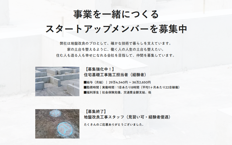 求めている人材 【必須条件】 ・普通自動車免許をお持ちの方(免許取得年齢に達していない方は持っていなくても可) ・挨拶やコミュニケーションを大切にし、チームで協力して現場を円滑に進められる方。 【歓迎条件】 ・基礎工事の現場経験がある方 ・外構工事の現場経験もある方 ・小型車両系建設機械運転技能講習修了者 ・4tトラックの運転ができる方 ・バックホウの操作ができる方 ・玉掛け技能講習修了者 ・小型移動式クレーン技能講習修了者