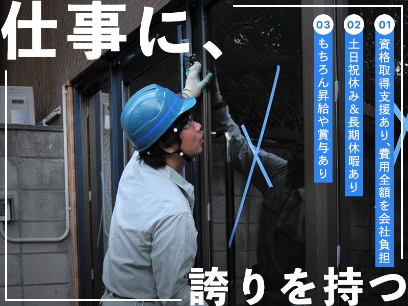 雇用形態 正社員 試用期間 試用期間中の給与条件に差異はありません。 3ヶ月(期間が延長する場合あり) 契約期間 期間の定めなし 歓迎キャリア \現場経験、業種問わず活かせます!/ ・建設業や現場作業の経験者は優遇します。 ・特にガラス、防水、塗装、建具工事など、当社の業務に関連する経験がある方は大歓迎です。 ・土木、解体、鳶工など、他分野での現場経験も活かせます。 ・大工、設備、電気工事、内装リフォームなど、多岐にわたる職種の経験者も歓迎します。 あなたの培ってきたスキルをぜひ当社で活かしてください! 【ハローワークでお探しの方もご応募お待ちしています。】