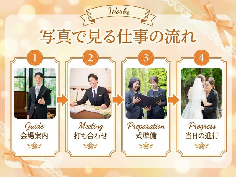 仕事内容 \\ たーっくさんの魅力をご紹介!//  ̄ ̄ ̄ ̄ ̄ ̄ ̄ ̄ ̄ ̄ ̄ ̄ ̄ ̄ ̄ ̄ ̄ ̄ ̄ 【POINT.01】頑張りはしっかり還元 ■賞与年2回+最大40万円のインセン支給! 【POINT.02】引越し手当15万円 ■U・Iターンも大歓迎! 【POINT.03】Thanks Trip休暇 ■勤続5年で5日間、 10年で10日間の連続休暇あり! 【POINT.04】産育休の復帰率100% ■家庭との両立もバッチリ支えます◎ ※2025年12月実績 【POINT.05】婚礼利用割引あり ■本人・家族も使えるオトクな割引! >>スタッフの結婚式実施率100% 【POINT.06】社内イベントも満載 ■運動会や部活動など仲間との交流も豊富 ……… 結婚式を上げたい人を 増やすという理念の中で、 『働く人にも、生き生きしてほしい』 そんな想いから、業界内でも珍しいほど 手厚い環境を整えています! - \\ 私たちの”シゴト”と”ミライ” // 【シゴトのこと】 まずは「感動創造のプロ」を目指す  ̄ ̄ ̄ ̄ ̄ ̄ ̄ ̄ ̄ ̄ ̄ ̄ ̄ ̄ ̄ ̄ ̄ 入社後は、ウェディングプランナーとして お客様の一生に一度の晴れ舞台を プロデュースします。 式場見学のご案内から、 プランニング、当日のサポートまで、 誰よりもお客様に寄り添い、 「人を幸せにするとは何か」を 実践から学んでください。 この経験こそが、あなたの キャリアの全ての土台となります。 【ミライのこと】 その先にある、無限のキャリア  ̄ ̄ ̄ ̄ ̄ ̄ ̄ ̄ ̄ ̄ ̄ ̄ ̄ ̄ ̄ ̄ ̄ プランナーとして経験を積んだ先には 明確なキャリアステップと、 ワクワクする未来が待っています。 ▼2〜3年後:チーフプランナー ▼5年後:支配人 ▼そして、その先へ:新規事業への挑戦 私たちは、結婚式のプロとして培った 「人を幸せにするノウハウ」を 様々なフィールドでも 活かせると確信しています。 ……… 私たちの仕事は、 結婚式を創るだけで終わりません。 その先にある、 地域の未来を創る挑戦に あなたも参加しませんか? - 【仕事内容】 結婚式という一生に一度の舞台を プロデュースする"感動の仕掛け人"へ。 カンタンに《 仕事の流れ 》をご紹介!  ̄ ̄ ̄ ̄ ̄ ̄ ̄ ̄ ̄ ̄ ̄∨ ̄ ̄ ̄ ̄ ̄ ̄ 1)ヒアリング: 新郎新婦様の理想をヒアリング 2)プランニング: 結婚式プランをご提案 3)打ち合わせ: 5~6回の打ち合わせで詳細を具体化 4)結婚式当日: 様々なチームと連携/式をプロデュース 5)アフターフォロー: 結婚記念日にはレストランへご招待など \\ 未経験でも大丈夫!// 最初は、先輩のアシスタントとして 簡単な業務からお任せします! ―――――――――――――――――… ブライダル × 地域活性 = 茨城の未来 ―――――――――――――――――― 例えば、今まさに構想しているのが 『古民家再生プロジェクト』。 日本の文化や美意識が詰まった 古民家を再生し、その地域の魅力を 最大限に引き出す。 それは、文化の継承や地域振興に繋がり、 国内外から多くの人が集まる ”感動の舞台”になるはずです。 これは、ほんの一例。あなたの 「地元がもっと面白くなるかも!」 というアイデアが、 会社の新しい事業になるかもしれません。 代表との距離も近いので、 その熱い想いを直接ぶつけてください! - // さらに…! \\ 「オープニングスタッフ」 として働きたい方にも BIGチャンス★★ 2026年 4月には新しい結婚式場がOPEN予定!「スターティングメンバーとしての経験を積みたい」という希望も大歓迎なので、遠慮なくご相談ください◎ みんなで一から作り上げる楽しさを体感しながら、新しい結婚式場のオープンを一緒に彩りましょう!