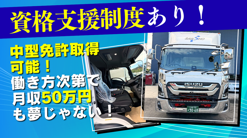 仕事内容 【普通免許でスタートOK/働き方を選べる4tドライバー/希望に合わせてガンガン稼げる!】 4tトラックでの配送をお願いします。 走行距離: 近距離/1日約150km~250km(関東圏内) ⇒月給26万~36万円 フリー/1日約250km~600km(関東・関西・九州) ⇒月給32万~50万円 配送件数:1日約5~6件 ★最新設備搭載の専属車両です! バッグアイモニター・ドラレコ・デジタコ装備 <稼ぎたい!そんな方大歓迎!複数コースがございます!> ■食品配送 食品センターへアイスやチョコ、納豆やヨーグルトの配送 ■建材配送 工場や現場、倉庫へプラスチック製のパイプなどの配送 ■自動車部品配送 工場や倉庫へのパレット配送メイン。 ■日用品配送 倉庫や店舗へトイレットペーパーやティッシュなどの配送。 大手ドラッグストアへのルート配送も選べます。 ■その他、雑貨や印刷物など ―――――――― <1日のながれ(例)> 06:00…出発 09:00…都内到着・積み作業開始 09:30…積み荷作業終了 14:00…事務所付近にて翌日の積み荷作業 16:00…帰社・終業・退勤 ―――――――― 【普通運転免許があればOK!】 ⇒資格取得支援制度あり! ◆中型免許 ⇒資格取得でぐんぐん昇給! ◆大型トラック⇒月収60万可能! 【株式会社三昇について】 弊社は2006年に設立し、2025年で20期目を迎えました! 一般貨物輸送~建材、食品と幅広く手掛け、全国エリアまで仕事が充実しているため 仕事を自由に選択することが可能!あなたらしく働ける環境です◎