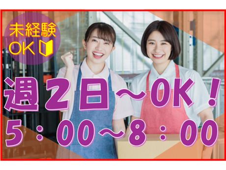 固定時間制 勤務時間 【勤務時間】 5:00~8:00(休憩なし、実働3時間) 【勤務曜日】 月、火、水、木、金、土、日、祝日の中で 週2~5日、シフト制 ☆週2日~OK! ☆勤務曜日は相談可 ★残業は基本的にございません★ ※繁忙期は1・2時間程度の残業が発生する可能性あり 平日のみOK/週2・3日からOK/週4日以上OK/早朝/午前/1日3時間以内OK