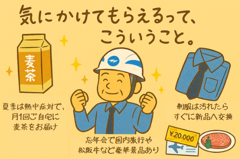 【保険制度】 雇用保険、労災保険、健康保険、厚生年金 待遇・福利厚生 【福利厚生】 ◆◇◆ 福利厚生・待遇 ◆◇◆ ◎ 交通費規定支給 ◎ 残業代全額支給・各種手当あり ◎ 社会保険完備(法令による) ◎ 資格取得支援制度(費用は全額会社負担) ◎ 有給休暇・介護休業制度あり ◎ 制服貸与(夏は空調服・冬は防寒着) ◎ 入社祝い金最大10万円支給(支給条件あり) ◎ 法定研修あり(4日間・合計30時間/研修費3万4400円支給) ◎健康診断 ◎公的資格取得・⽀援 ◎社員登⽤あり ◎バイク通勤OK ◎⾞通勤OK