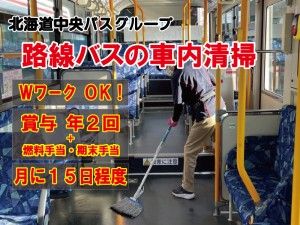 仕事内容 ★イチオシのポイント★ ◎賞与支給(年2回) ◎月15日程度シフト制勤務 ◎未経験者OK ◎シニア世代活躍中 ◎マイカー通勤OK ◎女性活躍中 <具体的には?> 北海道中央バスの車内 清掃パートのお仕事です。 勤務地は石狩市花川にある 石狩営業所で、バス通勤 ラクラクの勤務先です。 マイカー通勤もOKですので、 少し離れた場所(札幌市北区、 手稲区など)にお住まいの方も 是非ご検討ください。 主な作業は大きく分けて 「路線バス内の簡易清掃」、 「路線バス内の全体清掃」の 2つです。 〇路線バス内の簡易清掃 ・ごみ回収、分別 ・モップを使用した床の掃き 拭き清掃 路線を回って営業所へ戻ってきた バスは少しの時間営業所で待機を してから、次の路線へ出発します。 簡易清掃は、出発までの間に行う 作業で、基本的に1名で20分程 かけて清掃をします。 〇路線バス内の全体清掃 ・窓ガラスや手すり、つり革等の 拭き清掃 ・座席のほこり落とし作業 ・運転席や乗降口の拭き清掃 ・ごみ回収、分別 ・モップを使用した床の掃き 拭き清掃 その日は走らない予備のバス車両の 数台について、普段は手の届かない 場所も含めて車内全体のお掃除を 複数名で協力して行います。 作業時間は人数にもよりますが、 1台1時間~2時間程度です。 たくさんの方々が利用する公共 交通機関の清掃のため大変やりがい があり、きれいにした後は達成感も ありますよ! <この仕事の魅力って?> 〇同僚や営業所の職員の方以外 とは接する機会がありません ので、「たくさんの人とコミュニ ケーションを取るのは苦手…」 という、人見知りな方にも オススメのお仕事です。 〇営業所には休憩室が設けられて います。 バスが戻ってくるまでは待機時間 となることもありますので、 その際は休憩室へ戻って飲み物を 飲む等細かに休憩をはさみながら 作業ができます。 <経験が無くても大丈夫?> 大丈夫です! 同じような仕事の経験がない という方も、是非ご応募ください。 入社後は、経験のあるスタッフが 作業手順を丁寧に説明しながら、 仕事の内容を覚えていただきます。 一度流れを覚えれば、ある程度は 同じ作業の繰り返し(ルーティン ワーク)ですし、何かあれば スタッフが相談に乗りますので ご安心ください! 少しでも気になったら、 ぜひご応募ください!