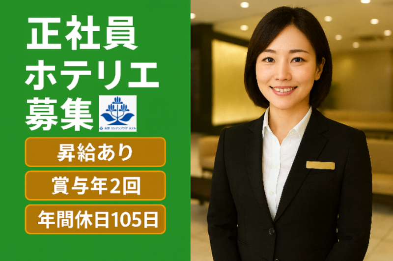 仕事内容 【経験者歓迎】長野リンデンプラザホテル 正社員 月給25~35万円|研修制度・昇給・賞与あり 「☆長野で人を幸せにするお仕事です☆」 雇用形態:正社員 【主な業務内容】 お客様をおもてなしするフロントスタッフとして勤務いただきます。 ・フロント接客業務全般 ・予約管理業務 ・各種データ処理 ・レストランの配膳業務(朝食) ※勤務地は「長野リンデンプラザホテル」もしくは「たびのホテルlit松本」のいずれかとなります。 ホテル業務全般を幅広くご担当いただくため、様々な経験を通して自然と成長できる環境です! 【一日の大まかな流れ(日勤)】 【午前中】 ・出社、制服に着替え ・引継ぎ ・チェックアウト対応 ・締め作業 【正午】 ・在庫チェック、発注 ・問合せメール対応など 【午後】 ・休憩 ・チェックイン準備 ・昼礼 ・チェックイン開始 【夕方】 ・引継ぎ、退勤 【様々な経験が積めるためスタッフ一人ひとりの成長が早く、メンバーの貢献度は大きいです】 ◎チャレンジを認め、応援する社風です。ホテル業界で自分ならではのキャリア作りに挑戦できます! ◎数字や企画など、経営に関わる部分に意欲があれば早い段階で携わることができます! ◎実行力があり、スピード感のある職場です。早い方は入社後2~3年で早期のキャリアアップも目指せます! ☆当事者意識を持ち、成長意欲のある方、これからホテル業界で叶えたい夢がある方、大歓迎です!☆ 【◇給与】 月給:250,000円〜350,000円 ※経験・スキルによって決定/昇給あり 深夜手当・残業手当あり 昇給:業績による ※2024年実績1回(4月) 賞与:業績による ※2024年実績2回(6月・12月) ※試用期間の3ヶ月間:条件同じ 【◇勤務】 ≪シフト制≫ 1日あたりの実働時間:最大8時間/日 休憩:1時間 時間外労働有無:有 年間休日105日 有給休暇:入社半年経過後10日~最高20日 【◇福利厚生】 各種社会保険完備(健康保険/厚生年金/雇用保険/労災保険) 制服貸与 昇給あり 残業手当 深夜手当(22時~5時は深夜手当を支給いたします) 深夜残業手当 退職金制度(勤続2年以上) 交通費規定支給(月額支給上限 40,000円) ★試用期間:3ヶ月(条件は本採用と同一) 【◇勤務地】 長野リンデンプラザホテル アクセス:JR長野駅(善光寺口)より徒歩6分 〇当ホテルは長野市の中心街に位置しており、観光・ビジネスなどの様々なニーズに合わせた、好アクセスの立地が特徴です! 【◇応募の流れ】 応募→書類選考→面接2回→内定 およそ1ヶ月 応募ボタンよりエントリーまたはお気軽にお電話ください! 〇人柄を第一に考えています! ★与える事が好き★ ★人を笑顔にしたいという想い★ ★今よりもっと成長したい意欲★ 〇面接当日にご体調がすぐれない場合は、ご無理をなさらずに面接日変更のご連絡をお願い致します。 【サンフロンティアグループについて】 1999年に東証一部(現プライム)に上場後、安定した業績を重ね成長を続けてまいりました。 お客様目線の細やかなサービスで、「また来たい」と思わせるおもてなしの心は、国内外から高く評価されています。 お客様と仲間のために心から尽くす『利他』の心を軸に、今後も事業拡大、成長を続ける将来性のあるグループで、働くことができます。 助け合い仲間のために働く社風です。若手、ベテラン問わず良い意見をどんどん賞賛し、推進する経営ポリシーがあるため、向上心があり、ホスピタリティ精神に溢れた従業員が多く活躍しています! ☆職場の一つ一つの改善点を、あなたの持つ長所で大きな伸びしろに変えてみませんか? ☆お客様の「ありがとう」の言葉を頂くために、仲間と共に楽しく一生懸命に働いてみませんか? ◎当社グループホテルで働くことで、他にないあなただけの強みを発揮して、喜びを感じながら日々成長し、豊かになっていける手助けができれば幸いです。