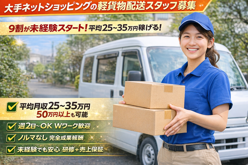 仕事内容: 仕事内容 大手通販サイトの商品を、軽バンで個人宅へ配送する業務です。 決まったエリア内でのルート配送が中心となります。 主な業務内容 * 軽バンを使用した個人宅への配送 * 配送エリア:秋田市近郊 * 比較的軽量な荷物が中心 * ノルマなし 研修制度があり、未経験の方でも安心して始められます。