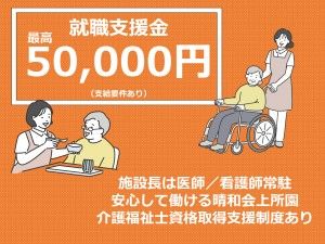 インフォメーション 通勤便利・多職種協働で働きやすさ抜群「晴和会上所園」 医療法人社団 晴和会(新潟市)は、1998年に産科婦人科クリニックから始まり、療養型病院、介護老人保健施設、通所リハビリ、居宅介護支援事業所、訪問看護・訪問介護ステーション、住宅型有料老人ホーム、保育園など、多彩な医療・介護・子育て支援サービスを地域に提供する包括的な医療法人です。 少子化・超高齢化が進む中、「患者様・入所者様・利用者様・ご家族様が望まれるもの」を追求する姿勢を大切にし、地域医療と在宅介護の両方に貢献しています。 働きやすい環境を整えるため、子育て支援「くるみんマーク」取得や定年年齢65歳をいち早く導入。介護職を安心して志す方のため、奨学金制度や資格取得奨励制度などのキャリア支援制度などもあります。 また上所園介護職(資格なし)の場合、最大5万円の就職支援金制度があり、初めての方やブランクのある方でも安心しやすい環境です ! アピールポイント 職員インタビュー!晴和会上所園のいいところって なんだと思いますか? 「施設長(医師)が積極的に他職種 に関わってくれます。 指示もわかりやすく、看護や介護 に活かせます!」 「夜勤でも看護師が必ずいるので、 介護士としては安心して働ける 環境です。」 「活気があり、挨拶やチームワーク 抜群なところが自慢です。」 「交通の便がよく、立地は最高です。 施設も明るい陽射しの入るきれいな 建物です」 「お休みがしっかりとれ、ほぼ定時で 帰れますし、お給料では土日手当が あるのでうれしいです。」