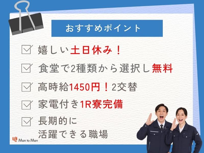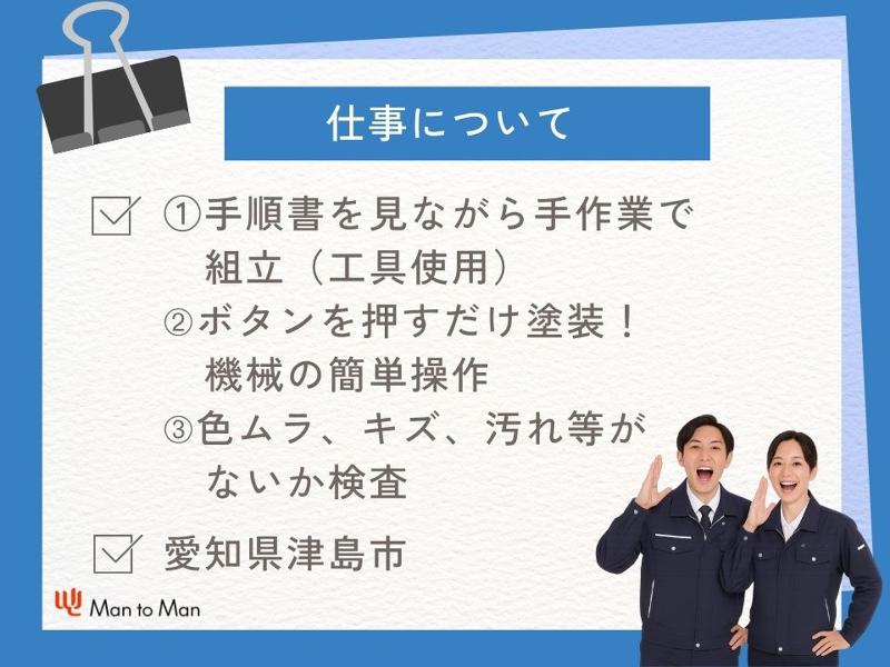 仕事内容: 【職種】 手順書を見ながらの組立や検査作業 【仕事内容】 ✨福利厚生充実✨ ✅更新手当 3ヶ月毎に3万円支給 ✅皆勤手当て 毎月1万円 ✅ランチが無料で食べれる❤ ================= 一人で黙々と繰り返し作業✨ 重量物もなく軽作業なので 男女や経験問わず活躍中(^^)/ お任せするお仕事は、 自動車の樹脂製品部品などの製造 【 作業詳細 】 ①手順書を見ながら手作業で組立(工具使用) ➁ボタンを押すだけ塗装!機械の簡単操作 ➂色ムラ、キズ、汚れ等がないか検査 繰り返し作業になるので 作業はすぐに覚えることができます! 空調完備のキレイな工場でのお仕事です✨ 完全土日休みになるので お休みはしっかり休めて 予定も立てやすい('▽')♪ ⌒⌒⌒⌒⌒⌒⌒⌒⌒⌒⌒⌒⌒⌒⌒ これを機に一人暮らしを スタートしようとお考えの方✨ こちらは家具家電付き寮もあり 寮費はずっと無料('ω')✨ ⌒⌒⌒⌒⌒⌒⌒⌒⌒⌒⌒⌒⌒⌒⌒ たくさんのご応募 お待ちしております('ω')❤